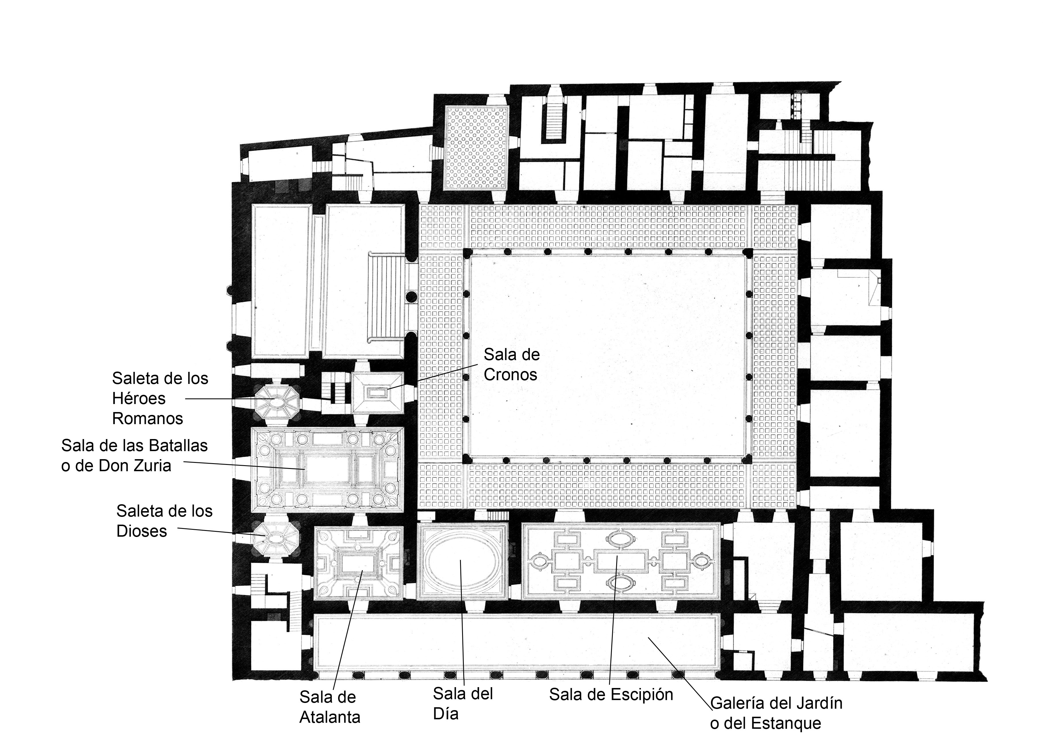 Por esos mismos años entabla contacto con el V Duque del Infantado, quien desde 1570 se encontraba reformando por completo su palacio de Guadalajara para adecuarlo a los gustos del renacimiento. Aunque la documentación demuestra que residió en Guadalajara entre 1578 y 1580, lo cierto es que el importante volumen de sus frescos –contrariamente a lo que se ha pensado, éstos se extendían no sólo por sus salas bajas sino también por el piso principal del edificio – obliga a pensar que el contacto entre el Duque y el pintor debió existir desde al menos 1572-1573. Así se desprende de varios factores y del hecho de que ya entre 1574-1575 se llevaban a cabo las labores de estuco de las bóvedas previas a la posterior decoración al fresco. Sea como fuere, allí plasmará un importantísimo imaginario en torno a la descendencia mítica de la casa del Infantado y a su doble ideario de caballeros-militares, pero a la vez eruditos y humanistas. Éstos frescos son además completamente excepcionales no sólo por su calidad sino por el hecho de ser los únicos de carácter histórico y mitológico del siglo XVI en España que, junto a los del Palacio del Viso del Marqués y a unos pocos fragmentos del palacio de El Pardo, han llegado hasta nuestros días.