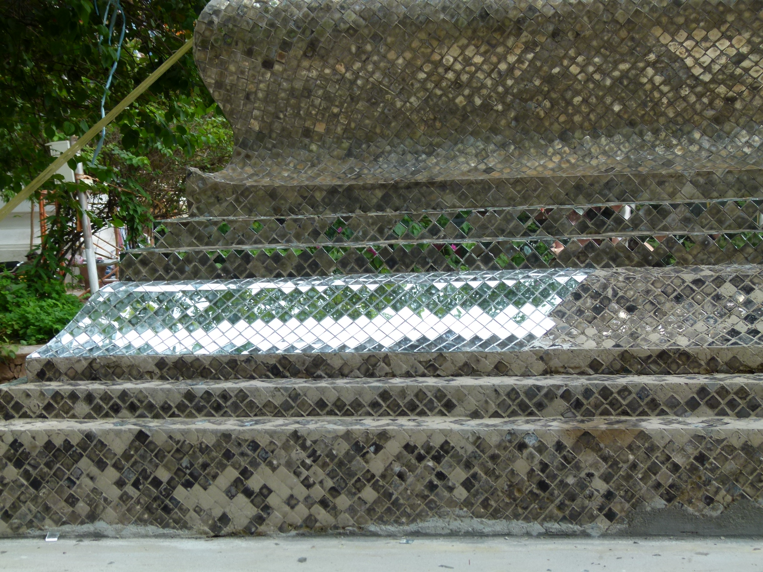 Pues bien, creemos que las imágenes que mostramos a continuación dicen más que cualquier discurso que podamos realizar al respecto. Entendemos que cuando la Unesco habla de materiales y técnicas tradicionales no puede referirse a pintar paredes con botes de Titanlux y a destruir por completo las teselas decorativas de las stupas para colocar en su lugar unos horribles espejos tipo “bola de discoteca”. Por no hablar de la sustitución de todas las losas de barro del recinto del templo (las cuales como se ven en la imagen no estaban en malas condiciones) por losetas tipo granito.