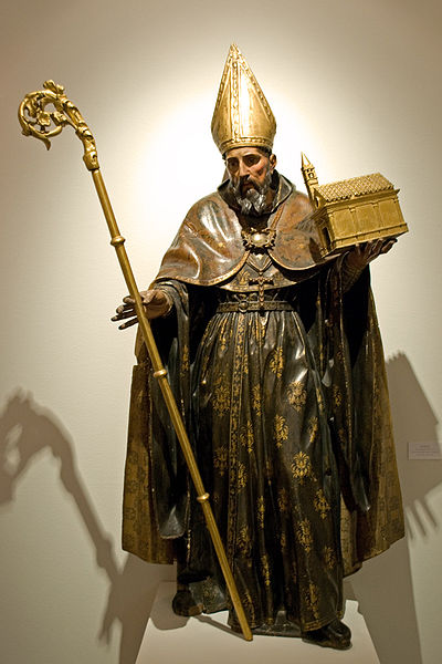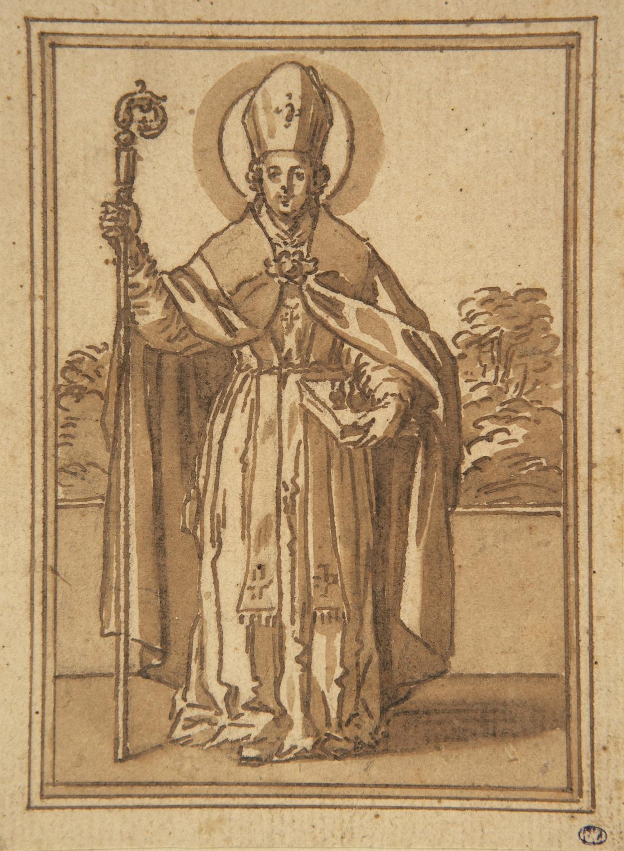 En el primer caso, en la ficha del museo de los años 90 se le identificaba con San Agustín, no entramos en temas estilísticos ni de autoría, sino en iconográficos. San Agustín suele aparecer como obispo pero lleva hábito negro debajo de la capa pluvial y además suele llevar una iglesia sobre su mano izquierda como en la representación escultórica de Dionisio de Ribas (convento de San Leandro, Sevilla, ca. 1650) mientras que lo que lleva el santo obispo del Princeton es un libro y dos ampollas de cristal. En este caso es reconocible un culto muy local: San Genaro en Nápoles con su relicario con las ampollas de Sangre como aparece en obras de Solimena (Tesoro de San Genaro, Nápoles) o en el de Andrea Vaccaro (Museo del Prado).