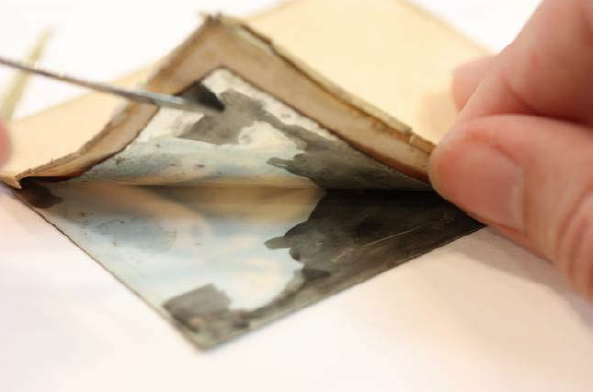 Esta miniatura tiene en su trasera de papel adherida una lámina de cobre plateada, y se ha intensificado el fondo oscuro pintando por detrás el marfil de negro. Otras veces se utilizaba lo que se llamaba “tiza roja”, un cartón rojo que proporcionaba calidez tonal, dando un tono vivo y saludable a las carnaciones. La trasera de la miniatura suele llevar, como protección, un papel sujeto por unos puntos de adhesivo, y en muchos casos sobre este último hay una vitela. En otros, la lámina de marfil se pega sobre un cartón grueso y rígido que aporta estabilidad para su manejo, además de facilitar la colocación en su marco. En cuanto a los marcos, es muy habitual encontrar papeles, cartones o telas que rellenan espacios huecos y fijan la miniatura al marco.