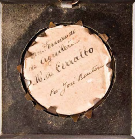 El retrato miniatura de Don Fernando de Aguilera nos muestra a un personaje joven, reconocible si nos fijamos en otros retratos posteriores como el que le haría Vicente Carderera. La obra está firmada en el lateral derecho del anverso por Joseph Bouton, célebre pintor y miniaturista, activo en Francia, España e Inglaterra. Va vestido a la moda inglesa, con ligero tupé, vigente en España a principios del siglo XIX. Es una obra de excelente factura, que permite apreciar la delicadeza y transparencia propia del marfil. Elaborada con un punteado minucioso, se logra crear el sutil efecto de sombreado en la barba.