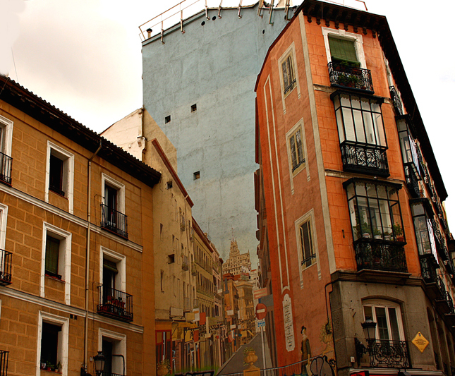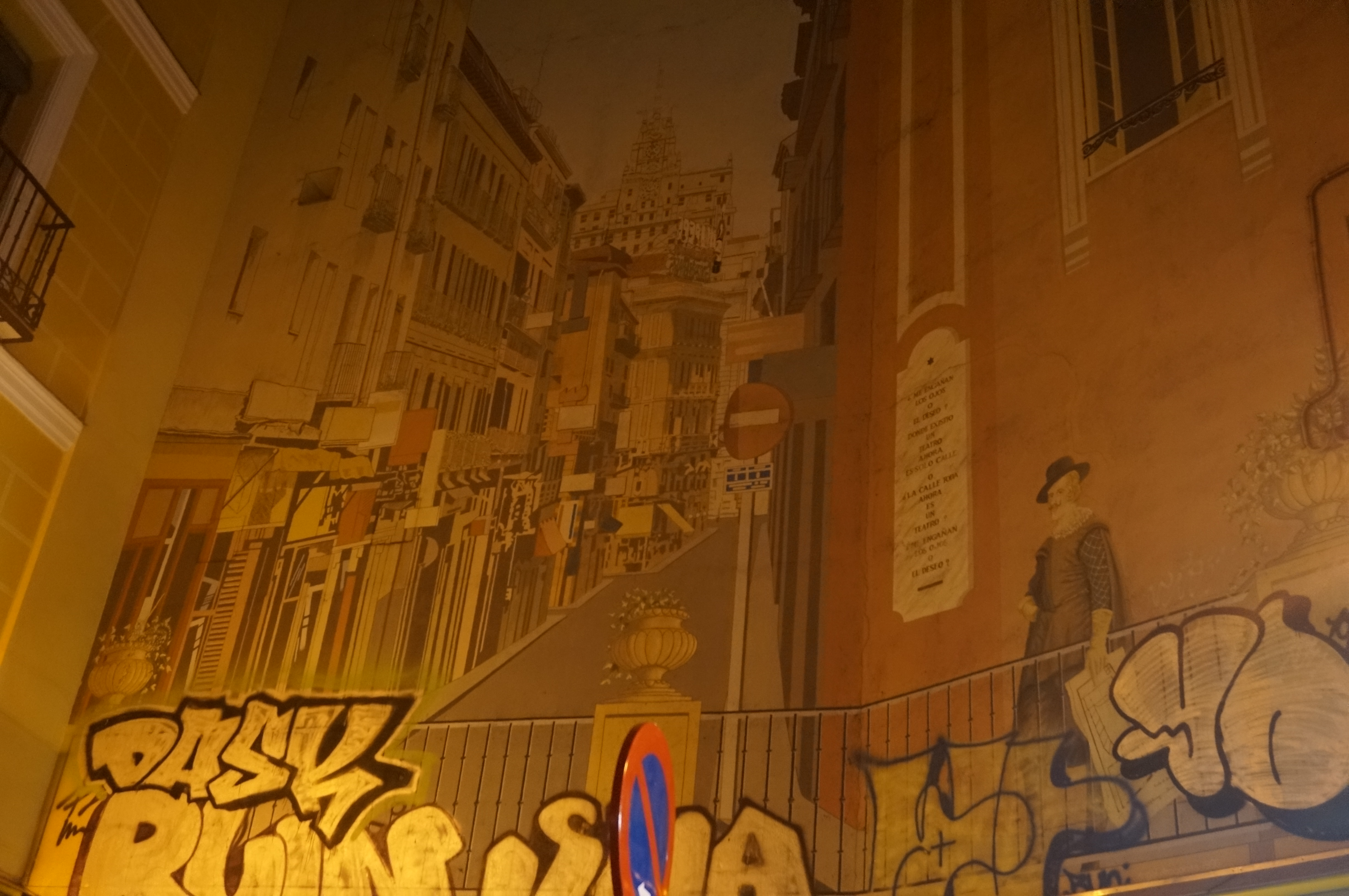 No se trata de un fresco, pero por su singularidad este trampantojo se ha colado en nuestra clasificación. El trampantojo se situa en un lienzo de fachada en la madrileña calle de la Cruz y nos remite al pasado literario que tuvo esta zona conocida como Barrio de las Letras, en el Siglo de Oro. En aquel período de la historia española, se vivió un florecimiento en las artes y en la literatura y ello trajo consigo que a la Villa y Corte llegasen pintores, artistas, artesanos, literatos, comediantes, y actores dispuestos a triunfar.