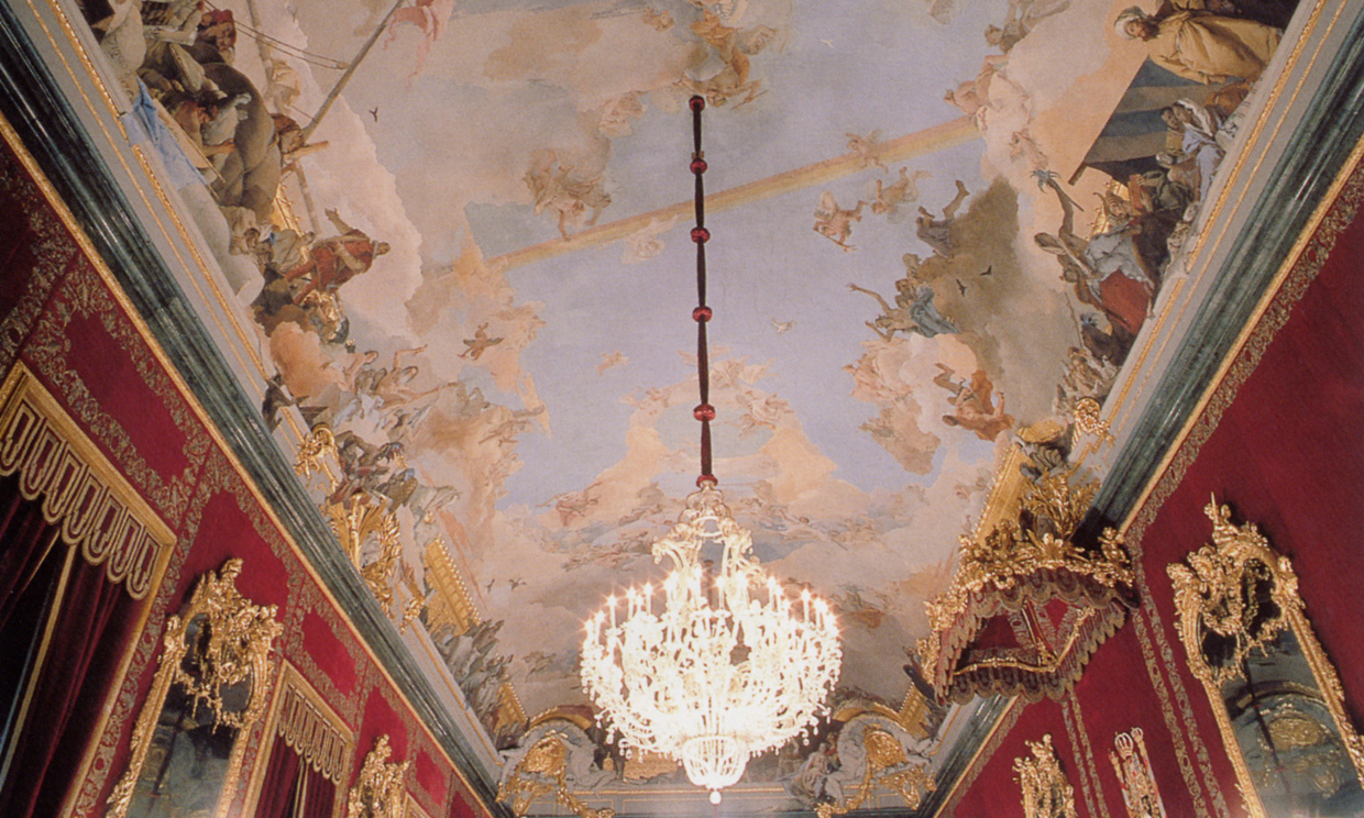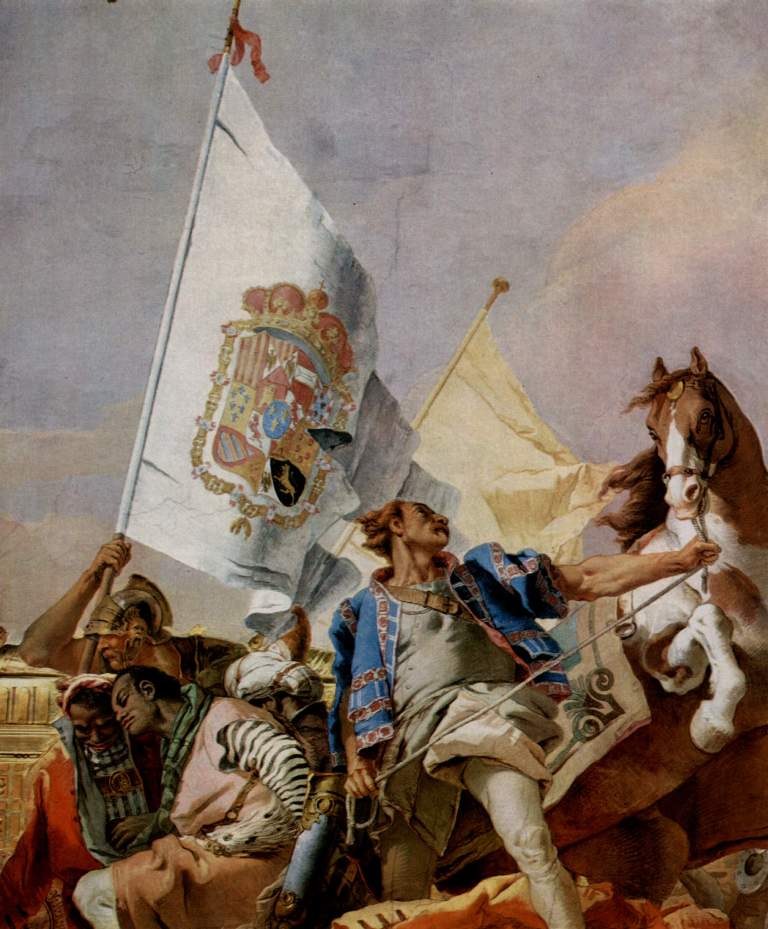 El veneciano Giambattista Tiepolo llegaba a Madrid en junio de 1762, acompañado por sus hijos y ayudantes Giandomenico y Lorenzo, con el encargo de pintar al fresco el Salón del Trono en el Palacio Real de Madrid. Tiepolo traía consigo un boceto al óleo, con todos los elementos que habrían de figurar en su obra definitiva. El tema representado suponía la glorificación de la nación española que, en el curso de los siglos precedentes, había llegado a ser una de las más poderosas del mundo. A través del lenguaje de las alegorías se ponía, también de relieve la nueva orientación política introducida por la Casa Borbón en España, la cual alcanzaría su máximo desarrollo durante el reinado de Carlos III. Así se unía la idea de la glorificación de la Monarquía Española, inmersa, de lleno, en la corriente europea de la Ilustración, con su no menos glorioso pasado.