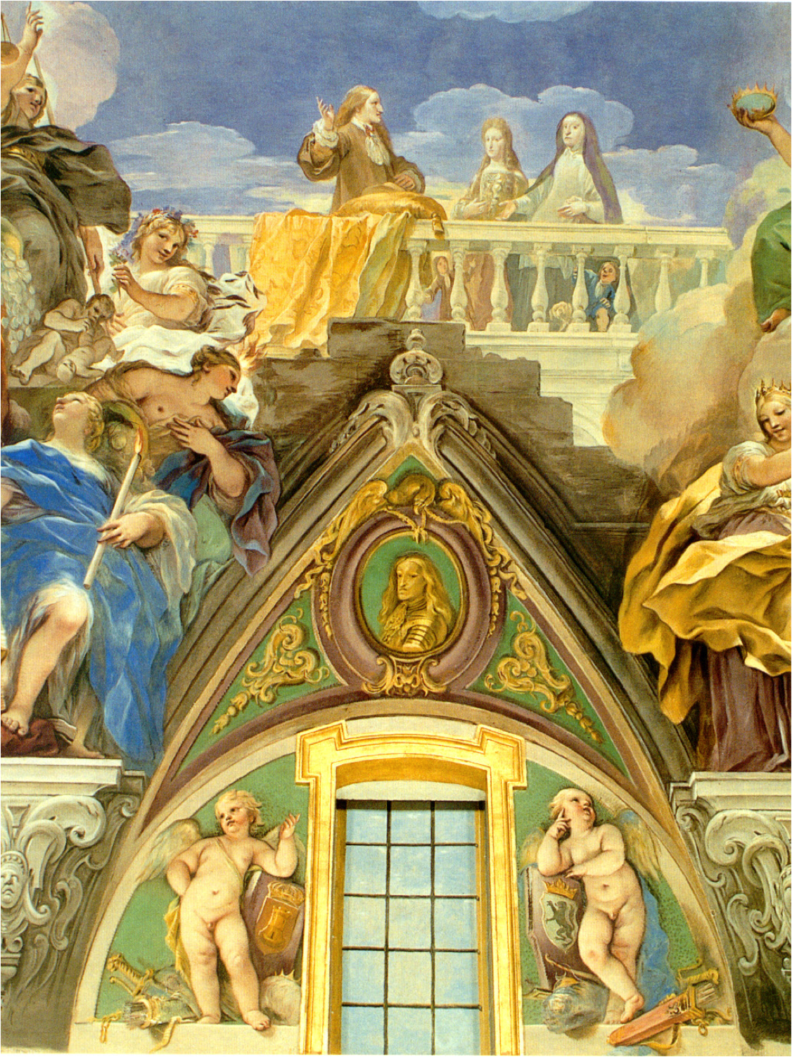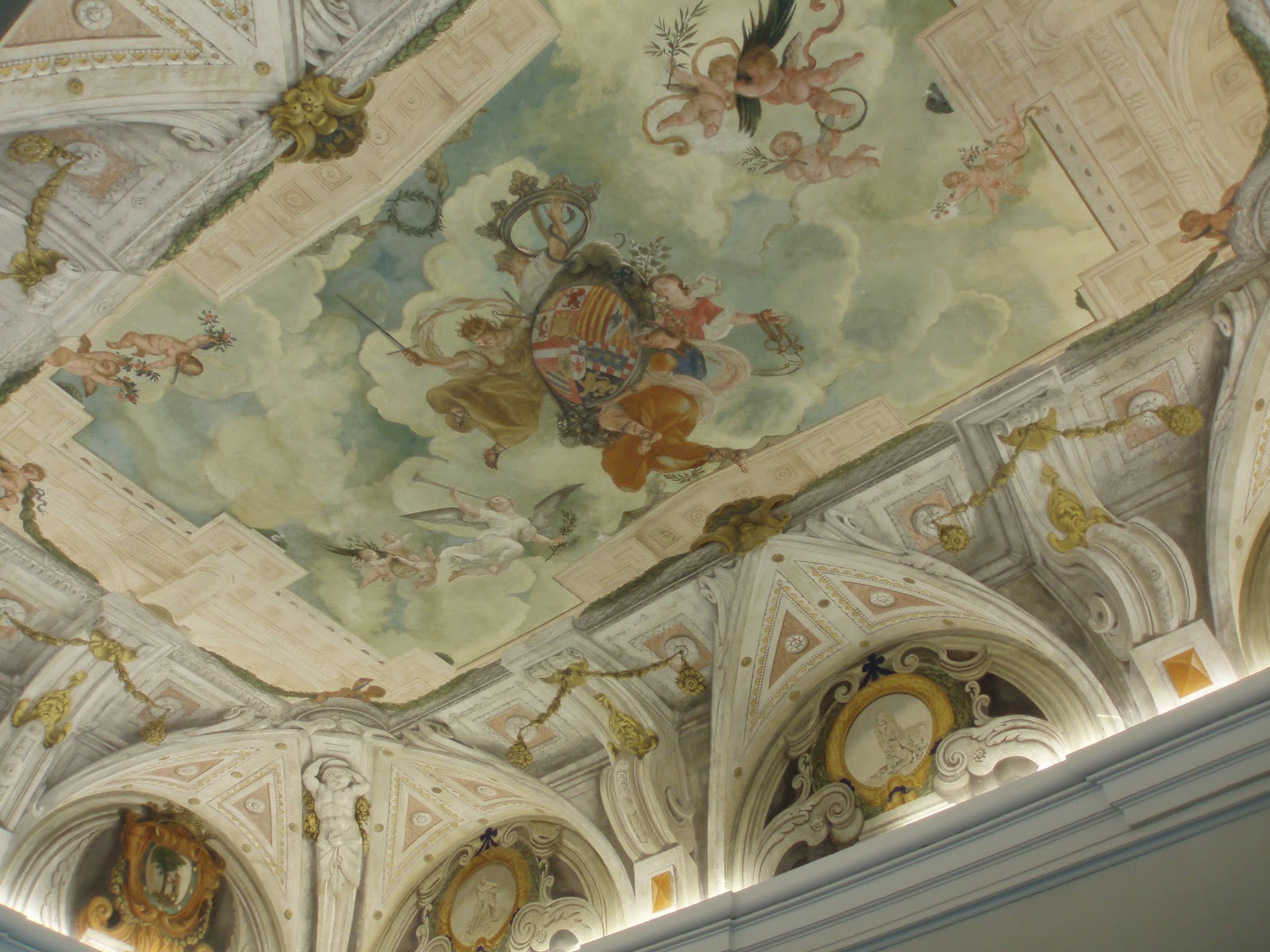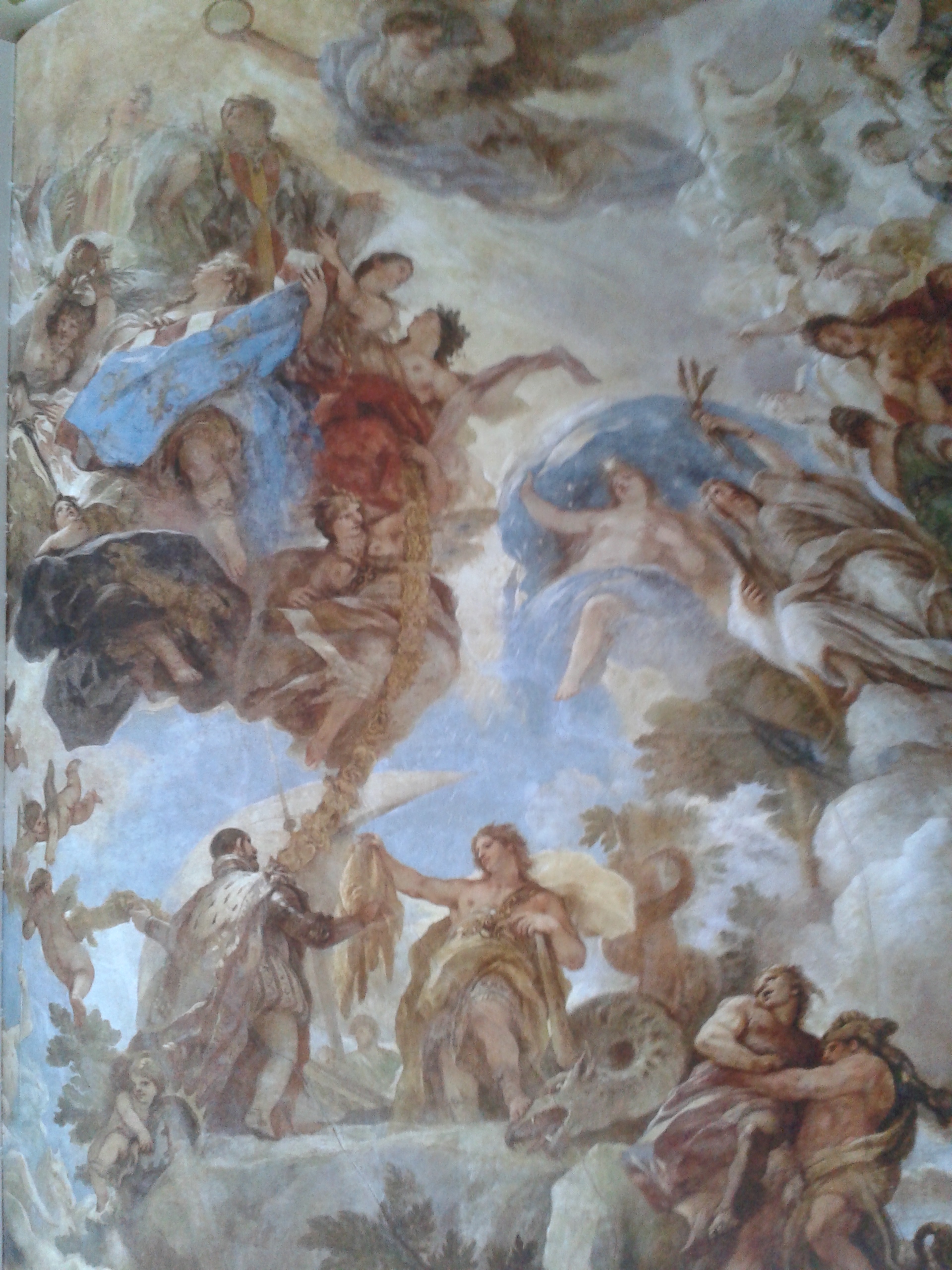 No es el más espectacular de los que aquí os hemos mostrado, ni siquiera es un fresco de enormes proporciones, pero su frescura y delicadeza hipnotiza a quien lo contempla. Se trata de una pequeña obra dentro del que fue en su día el despacho de Carlos II en el Palacio Real de Aranjuez. Pintado por Luca Giordano en escasas jornadas durante el año 1695, esta obra muestra la habitual maestría del pintor napolitano para la perspectiva. Es una pintura llena de fuerza, colorido y movimiento que tiene varias virtudes importantes. Una es que debido a las pequeñas dimensiones de la sala uno puedo verla muy de cerca, tanto que se encuentra como formando parte de ese cortejo estacional que contempla al rey Carlos II convertido en el Dios Jano. Esa cercanía es algo poco habitual en los frescos, normalmente dispuestos en grandes salas que hacen sentir empequeñecido al espectador. La otra gran virtud de esta obra es que durante muchos años estuvo oculto a la vista del público por un falso techo. Redescubierto en el año 2002 tras unas obras en el Palacio Real de Aranjuez, fue sometido a una pequeña limpieza antes de ser mostrado de nuevo al público. Todos los años que estuvo oculto permitieron que se haya conservado magníficamente, con un colorido vivaz que pareciera como si estuviera recién terminado por el artista.