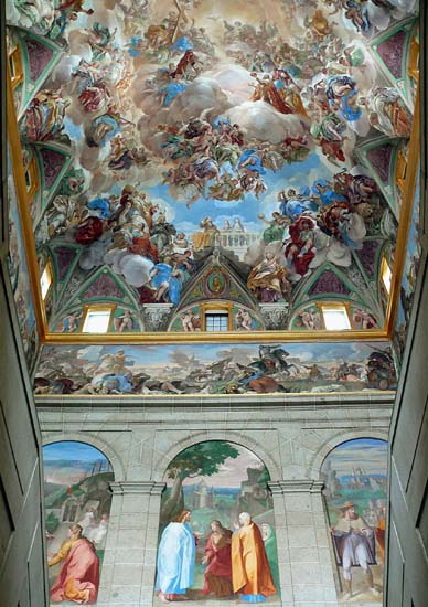 Giordano, máximo representante de las grandes apoteosis celestiales del siglo XVII y maestro del artificio teatral en la pintura, realiza en El Escorial una auténtica obra maestra. En ella el pintor aprovecha la estructura arquitectónica de la escalera y la incluye dentro de la composición pictórica. Así vemos cómo, en el inmenso cielo de la bóveda, dispone las figuras en círculos concéntricos, arrancando desde las enjutas de las ventanas en un sentido ascendente hasta el centro de la composición. En un ancho friso bajo la bóveda, realiza un trampantojo simulando un tapiz o lienzo clavado en la pared. En él se representa la batalla de San Quintín y a los arquitectos Juan de Herrera y Juan Bautista de Toledo enseñando el proyecto del monasterio a Felipe II. En los lunetos de las ventanas se representan las victorias militares del emperador Carlos V y los retratos de Felipe IV y Carlos II. En el centro de la bóveda está representada la Santísima Trinidad, a su derecha, la Virgen con ángeles y enfrente varios reyes que fueron santos. San Lorenzo está representado arrodillado con la parrilla a sus pies, como intercesor de los reyes Carlos V y Felipe II ante la Santísima Trinidad. Toda la escena aparece rodeada por ángeles músicos. Algo más abajo aparecen las cuatro Virtudes Cardinales en las esquinas y en los lados mayores, dos mujeres entronizadas representan la Monarquía y la Iglesia Católica. Y por útimo, en una balaustrada en el margen occidental del fresco, aparece su fundador, el rey Carlos II, explicando el significado de la obra a su esposa Mariana de Neoburgo y a su madre Mariana de Austria. En definitiva, toda una orgia de luz, color y movimiento para los sentidos!!!