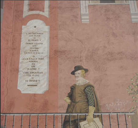 Dos detalles más, nos hablan del desaparecido Corral de la Cruz, uno es el plano del corral que sostiene en la mano Felipe IV y otro la placa que reza “¿Me engañan los ojos o el deseo?, donde existió un teatro, ahora es solo calle, o ¿la calle toda ahora es un teatro?¿Me engañan los ojos o el deseo?