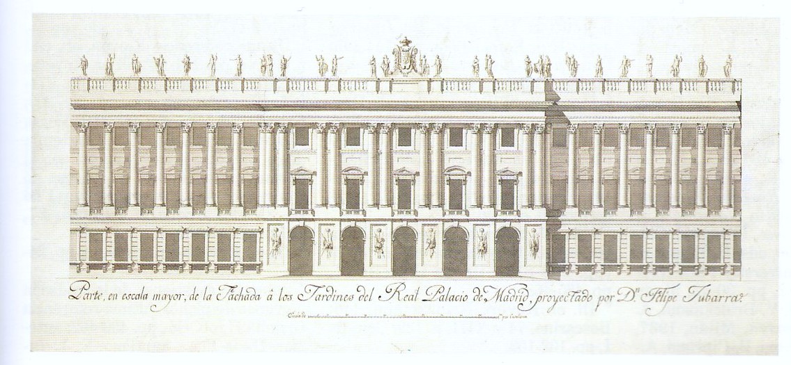 Tras la destrucción del Alcázar y desechada desde el primer momento la idea de reconstruirlo como estaba, Felipe V, piensa en traer al mejor arquitecto activo de ese momento en Italia: el abate Filippo Juvarra (1638-1736). Juvarra ideó un magnífico proyecto de grandes dimensiones: con 1.700 pies de fachada (400 m. Aprox.), 34 entradas, 23 patios, el principal de 700 pies de largo por 400 de ancho. Un palacio que estaba destinado a albergar no sólo la residencia real, sino también locales para los consejos, secretarías de Estado, biblioteca, iglesia, teatro, etc. El proyecto tenía unas 2000 columnas, otras tantas estatuas, y debía estar rodeado de vastísimos jardines. En su diseño mezclaba la influencia francesa, con un gran desarrollo de la horizontalidad, y la italiana, con referencias a los proyectos de Bernini para el Louvre.