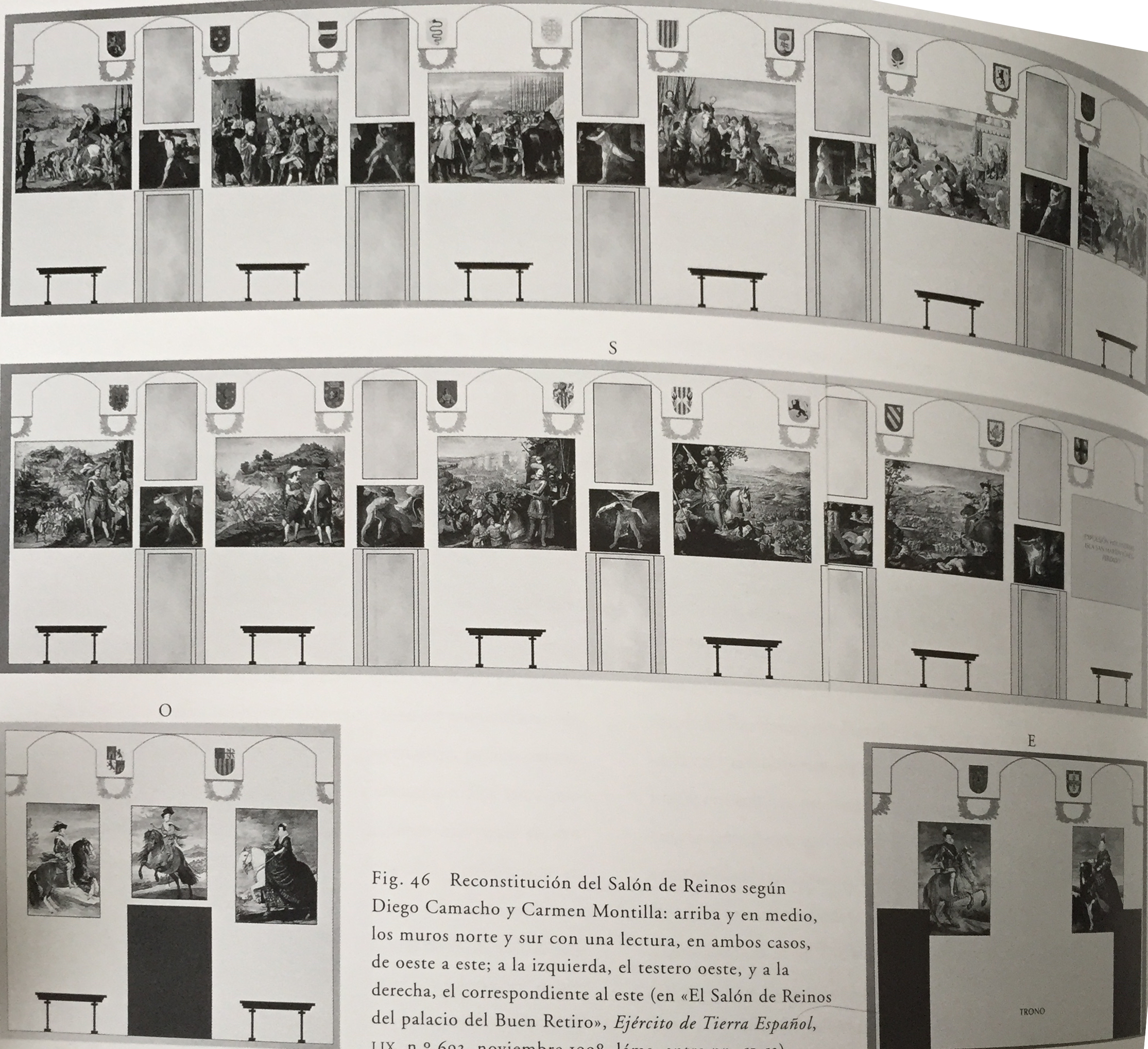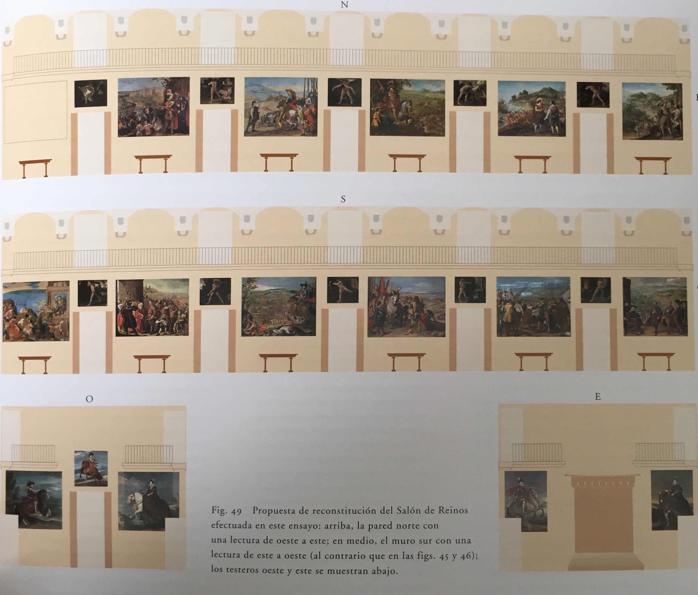 La conservación tanto del espacio físico como de casi la totalidad de la decoración pictórica de la sala, a excepción del cuadro de Eugenio Cajés que ya hemos mencionado, ha permitido la recreación virtual del espacio en múltiples ocasiones. Tanto Brown y Elliott en su libro «Un palacio para el Rey», como Diego Camacho y Carmen Montilla en su artículo para la revista del Ejército de Tierra, como más recientemente Carmen Blasco en su «proyecto hacia el pasado» o la reconstrucción del ya difundo profesor Álvarez Lopera, en el catálogo de «El palacio del rey planeta», han pretendido dar respuesta a la incógnita de cómo estarían colocadas las obras. A nuestro entender, es la reconstrucción del profesor Álvarez Lopera la más acertada, aunque la reconstrucción virtual que muestra el Instituto Cervantes es la realizada por Carmen Blasco (aquí).
