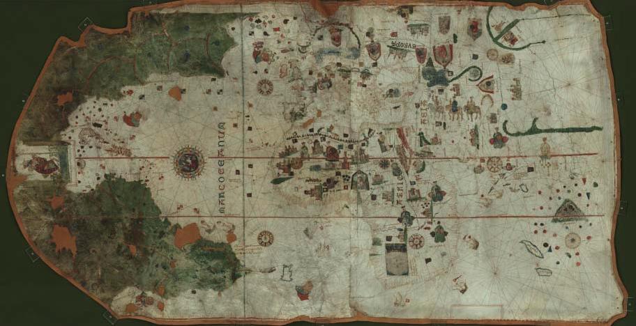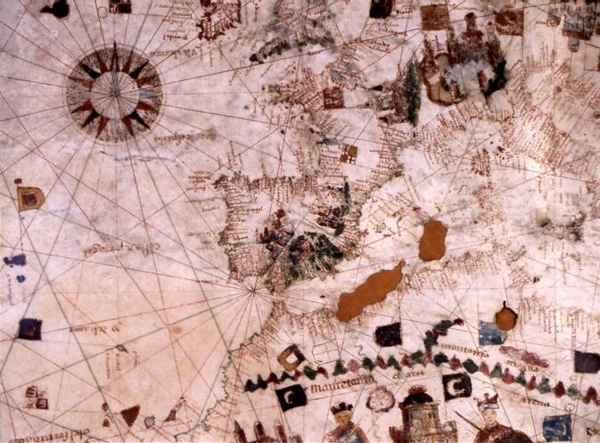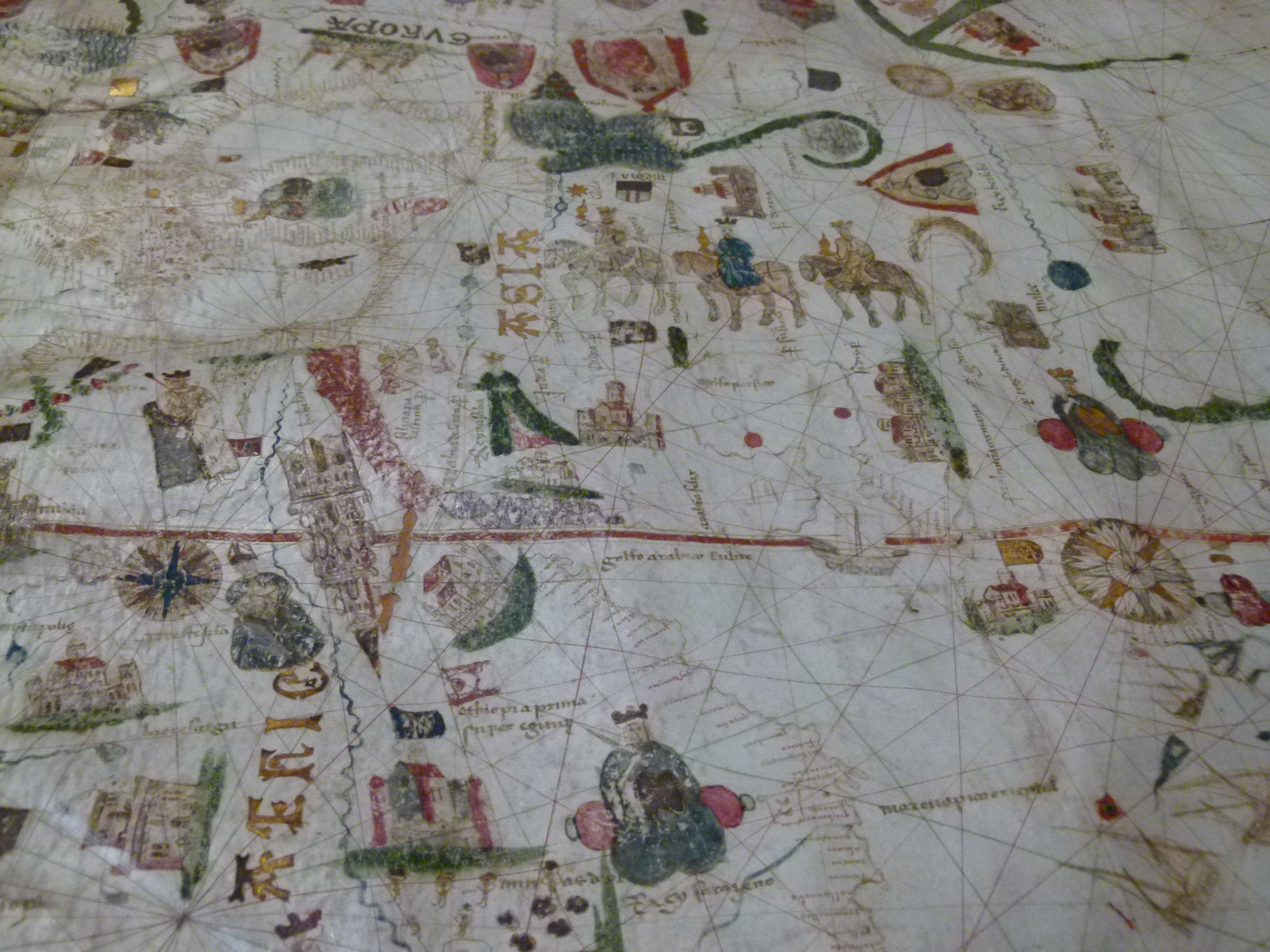 En esa contemplación detenemos primero nuestros pasos en la Sala de los Descubrimientos y os hacemos partícipes de una de nuestras piezas favoritas. Se trata de la Carta de Juan de la Cosa, un pergamino que tiene la importancia de ser la primera carta náutica conservada en la que se incluye la representación de América. Es una carta hecha por el marino Juan de la Cosa, con objeto de mostrar a los Reyes Católicos los nuevos descubrimientos realizados entre 1492 y 1500, la extensión del imperio ultramarino y las conquistas llevadas a cabo por otras potencias europeas rivales. La carta náutica puede parecer un simple mapa, en el que las costas y sus accidentes están definidos perfectamente y donde se pueden ver los topónimos de las ciudades y puertos, pero además el mapa está totalmente cubierto por un entramado de líneas que forman la red de rumbos. Además, destaca el hecho de la representación de los vientos de modo antropomorfo. Es curiosa de verdad, pararos un ratito a mirarla en detenimiento y descubrir por ejemplo a los Reyes Magos camino de Oriente…
