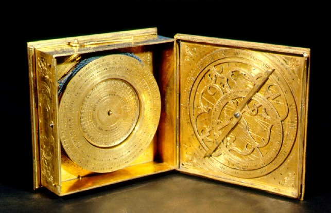 Otra de las joyas que podemos encontrar en este museo es un pequeño estuche, a simple vista una caja dorada, pero es mucho más que eso; se trata de un conjunto náutico y topográfico conocido como Compendio Astronómico de Felipe II. Aparentemente es una caja, pero en sus grabados exteriores e interiores nos encontramos con todo el saber astronómico de la época. El estuche fue realizado en 1596 por Tobías Volckhmer, prestigioso orfebre, matemático y cosmógrafo del Duque de Baviera. En la cubierta superior aparece grabado el mapa del hemisferio boreal terrestre, en proyección ortográfica sobre el plano ecuatorial con las regiones marítimas adornadas con naos y monstruos marinos. En el reverso aparece el mapa del hemisferio austral. Su tapa, fijada verticalmente, funciona como reloj solar, y cobija en su interior una brújula. En el reverso de la tapa inferior tenemos un astrolabio plano, y en los cuatros ángulos exteriores se representan con técnica de esmalte los cuatro elementos (Ignis, Aer, Terra y Aqua).