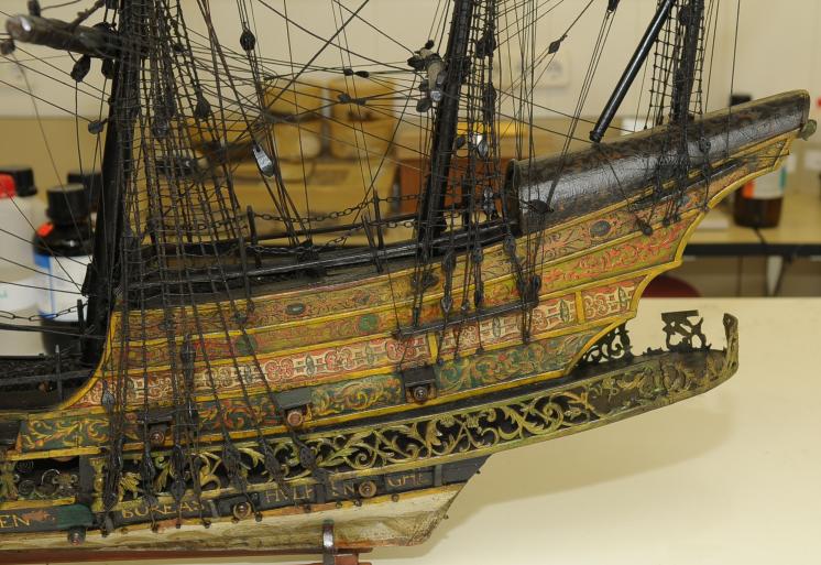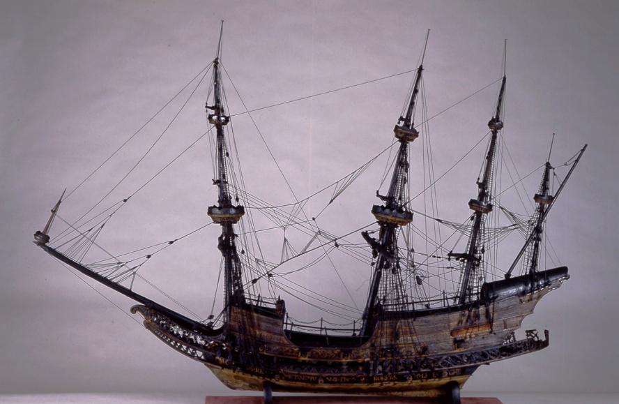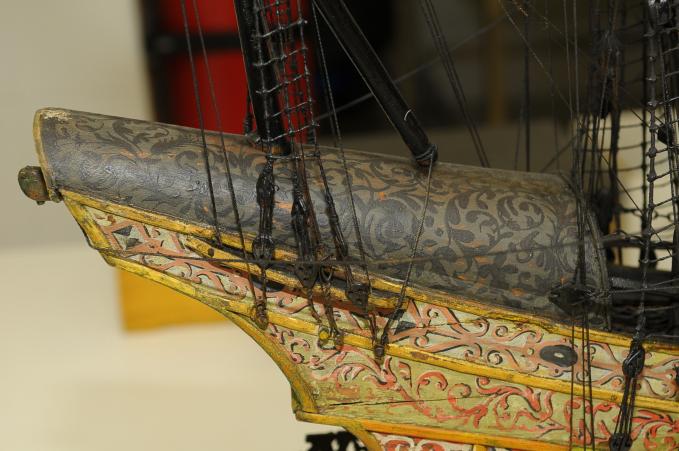 Dentro de las múltiples maquetas o modelos de barcos que hay en el Museo, en donde podemos encontrar desde barcos orientales, a realizados con clavos de olor, pasando por auténticas miniaturas que nos muestran cómo era la vida a bordo; destaca el Modelo de galeón, realizado en Flandes en 1593. Tiene su importancia por ser la única representación en tres dimensiones que se conserva de una embarcación del siglo XVI. Es un modelo tipo exvoto que carece de escala, realizado probablemente en agradecimiento a un feliz viaje o a una victoria, por lo que se lee en su inscripción “ICK VARRE MET NEPTVNVS EN BOREAS ULP EN GHE TOT DIE HAVEN DAER MI ANKER VALT ANNO 1593”; “Con la ayuda de Neptuno y Boreas fondeé el puerto el año 1593”. Era costumbre en el norte de Europa que este tipo de obras se colgara del techo de las lonjas, lo que exige que el modelo se realizara con proporciones especiales para su contemplación correcta desde abajo. Es una obra en madera policromada, con diferentes motivos, entre los que destacan los eslabones del collar de la orden del toisón de oro pintados sobre la batería alta y la balconada calada situada a popa.