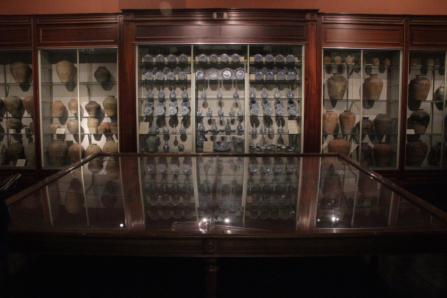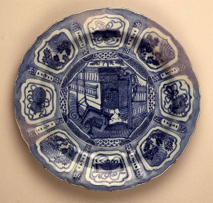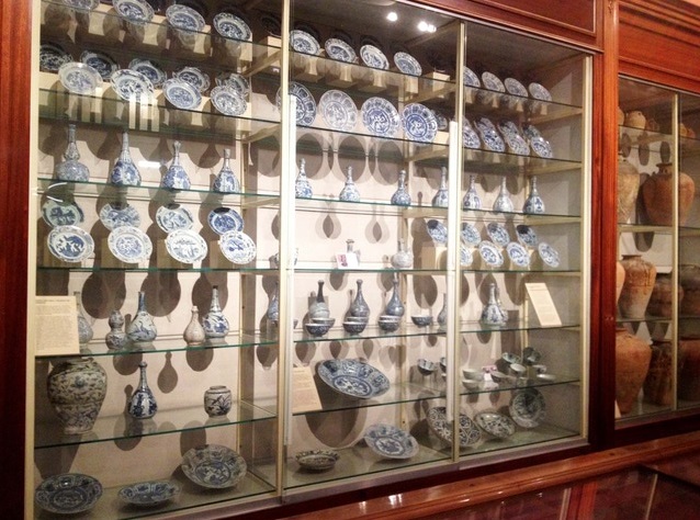 Uno de los conjuntos de piezas que llama más poderosamente la atención es la colección de porcelanas chinas que podemos contemplar en la Sala Nao San Diego. Las porcelanas chinas fueron mercancía habitual en las bodegas de los navíos durante el siglo XVI, sobre todo a partir del establecimiento de los portugueses en Macao en 1557 y de los españoles en Manila en 1571. Para los españoles este era un material novedoso y lujoso y es por ello que estaban muy interesados en su importanción. En naos hundidas como la San Diego, encontrada frente a las costas de Manila, se encontraron numerosas piezas de este material como esta Fuente de porcelana china que se exhibe en el naval. En su decoración encontramos motivos como ramas florales y símbolos del buen augurio, como la botella de doble panza, el tubo de bambú, y también libros, que simbolizan el conocimiento del pasado y la erudición.