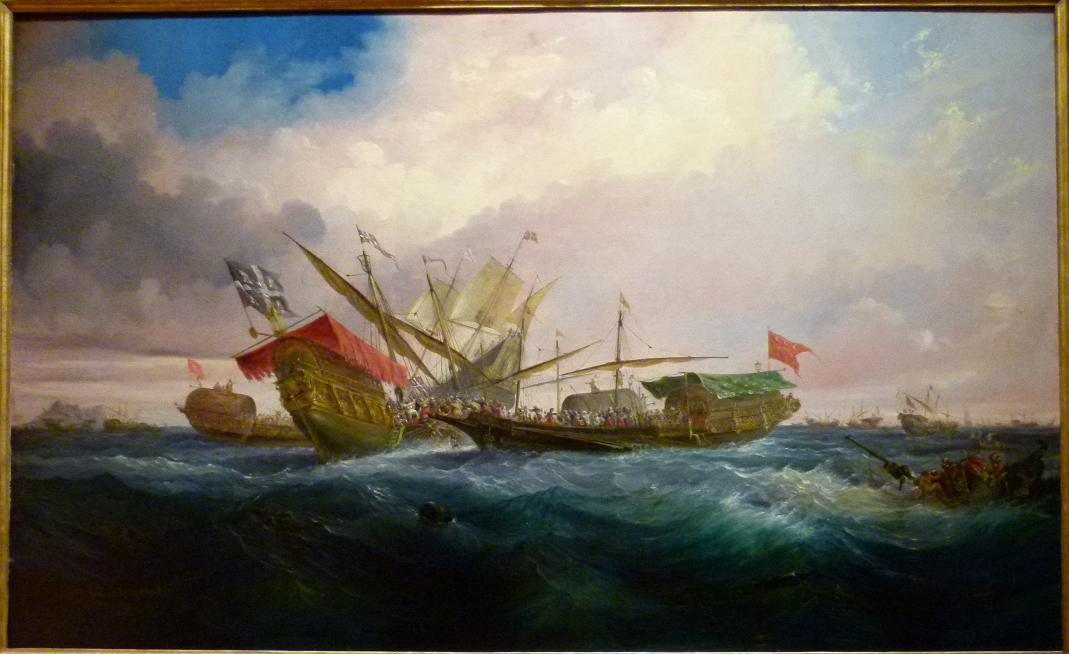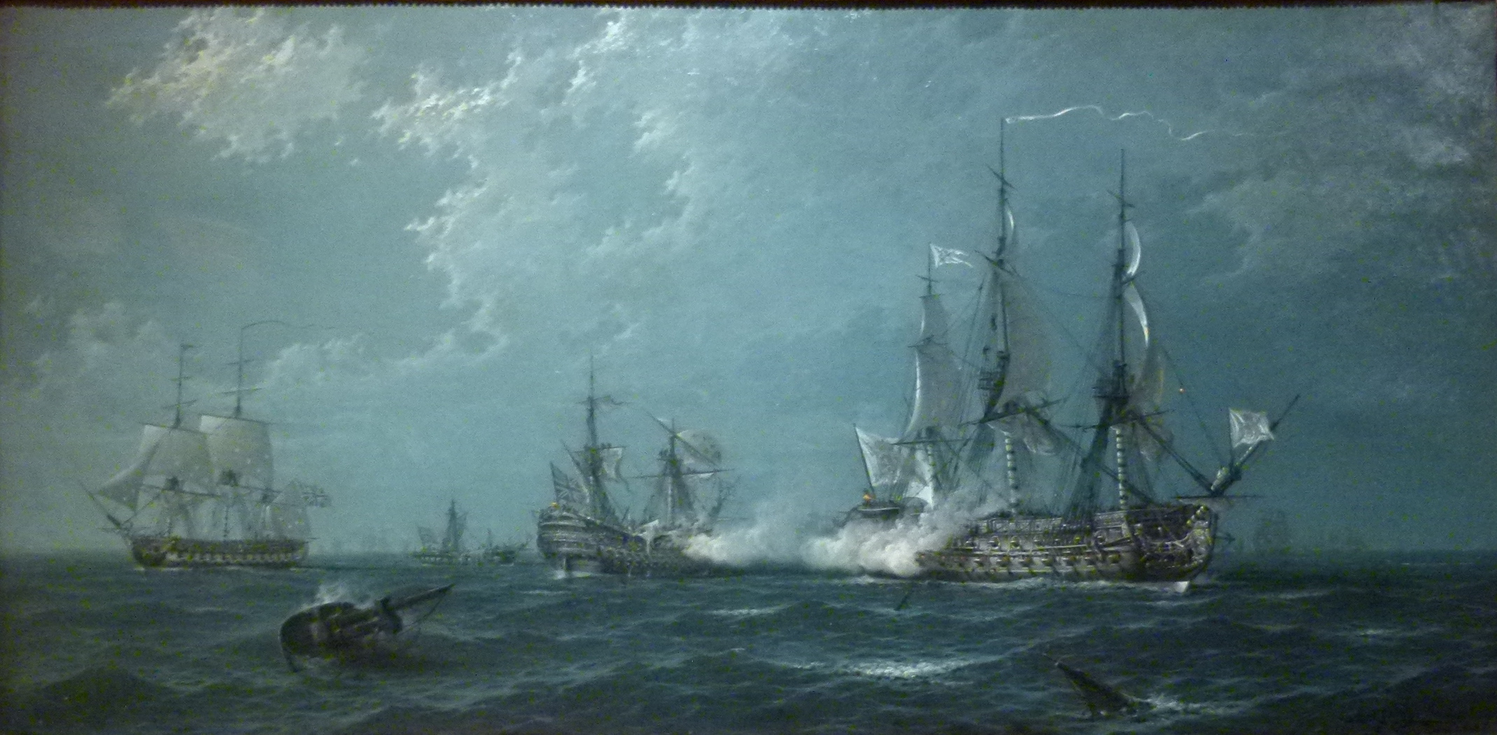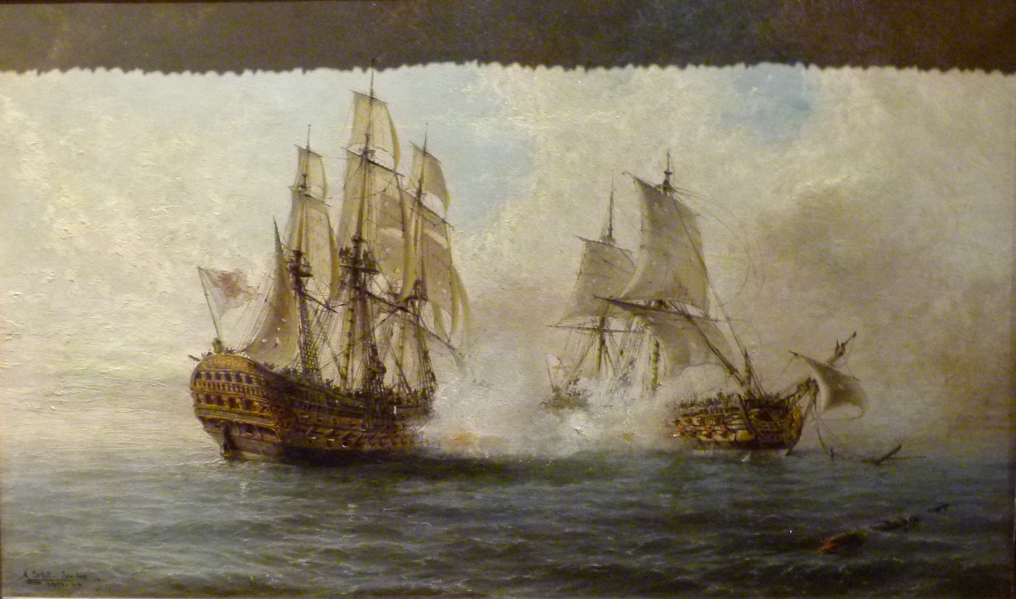Junto a ellos cuadros de navios impresionantes, surcando los mares regios y con sus velas hinchadas y magestuosas, o batallas cruentas en las que las naves luchan encarnizadamente unas con otras.