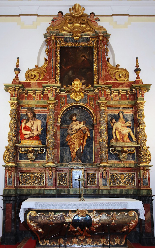 El retablo sigue una tipología muy madrileña, de tres calles separadas por columnas, en este caso de tipo salomónico, con el llamado sexto orden (capitel inventado por Francisco Bautista, que conjuga las hojas de acanto del corintio y una decoración de ovas y flechas). La calle central más ancha tiene un arco que acoge una excelente talla de San José, que recuerda a las esculturas del mismo tema de Luis Salvador Carmona. En las calles laterales se disponen un Ecce Homo y una Piedad. En el ático del retablo un cuadro que representa la Imposición de la Casulla a San Ildefonso por la Virgen, tema que nos recuerda que durante toda la edad moderna, tanto Getafe como Madrid, dependían del Arzobispado de Toledo, del que este tema de San Ildefonso es escudo y símbolo. El retablo está policromado imitando jaspes de colores (verde y rojo) y además usa el dorado en las decoraciones de roleos y macollas cartilaginosas que hay como transición del ático a las calles laterales y como remate de la calle principal y del arco.