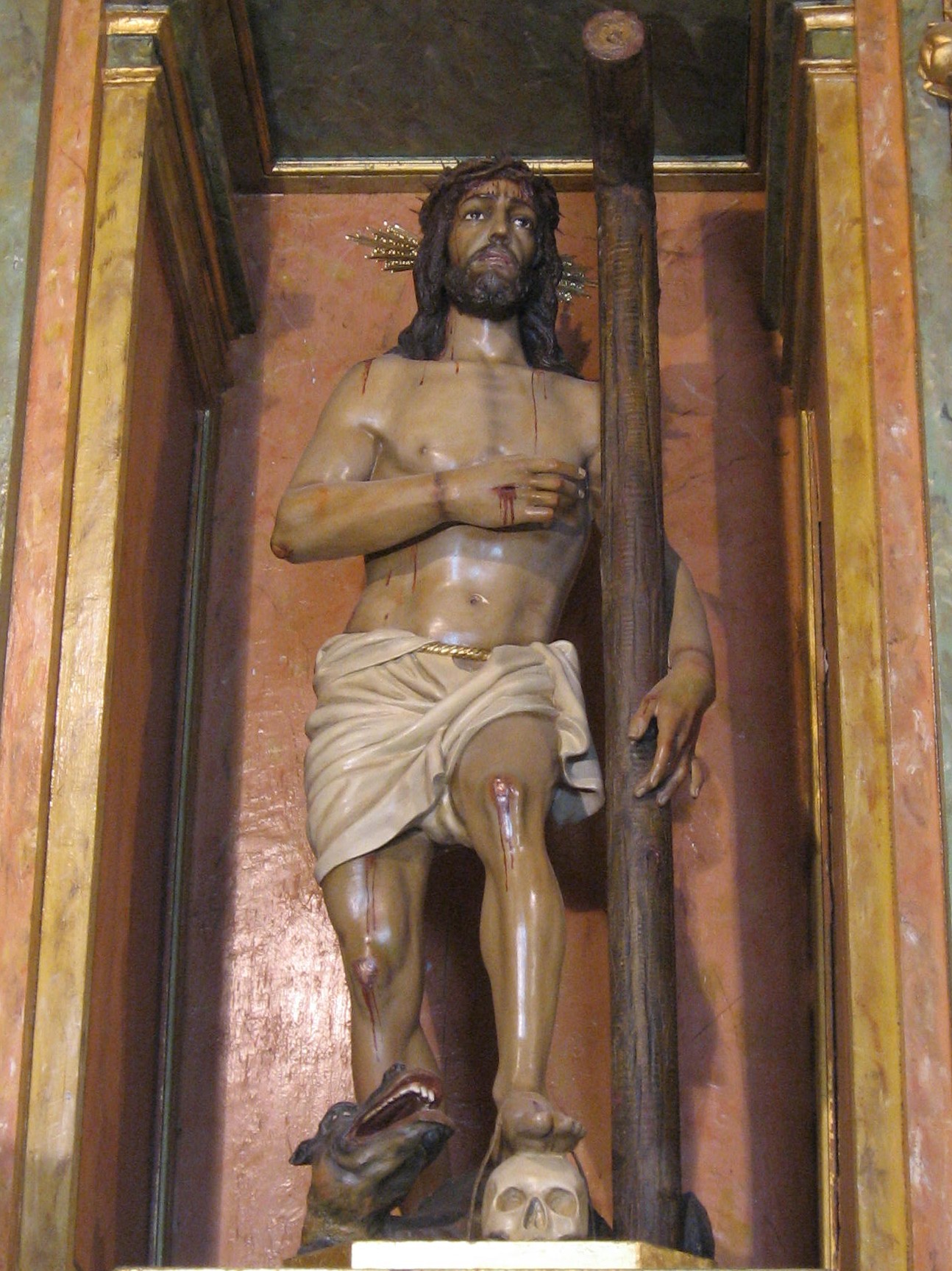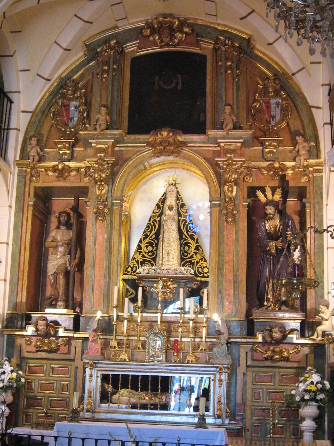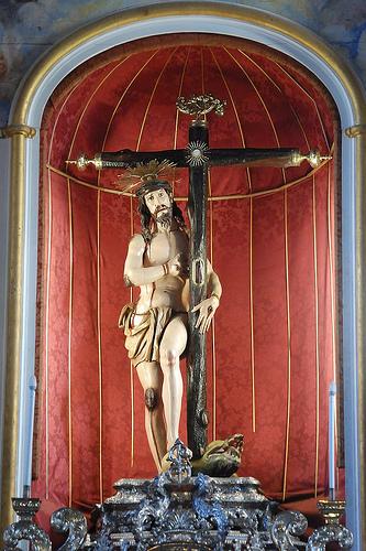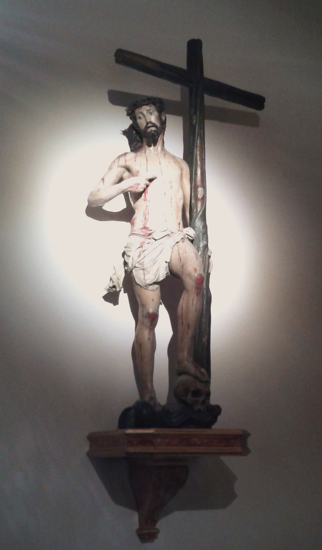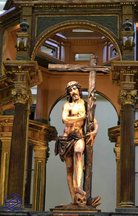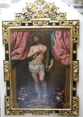 Volviendo al Cristo de los Dolores, su iconografía se hizo tan popular que con rapidez se extendió tanto en su forma de escultura como en pinturas que imitaban a ésta en un extraño camino de ida y vuelta que ya comentamos aquí en relación con la Soledad de las Victorias de Gaspar Becerra (aquí). Así podemos encontrar esta imagen en templos madrileños o de localidades próximas como las tallas anónimas del siglo XVII en la iglesia de San Jerónimo de la capital o en la capilla de la Virgen de la Soledad de Parla, obra esta última que responde a la intervención del arquitecto Bartolomé Hurtado, cuyo escudo preside el retablo y que era vecino de esa Villa.