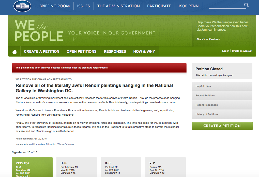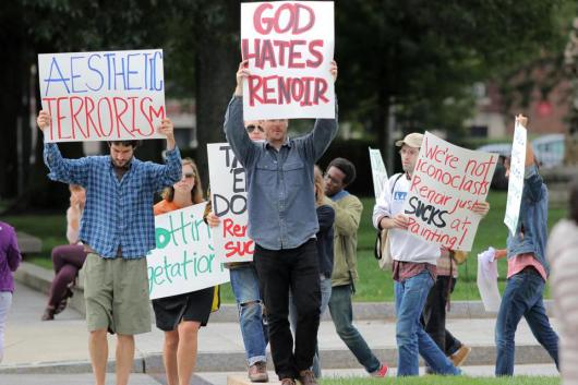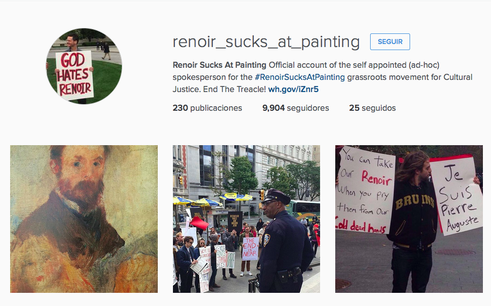 No obstante, todos pensaríamos que estas prácticas o ideas eran fruto del pasado y que hoy en día estamos en una cultura y una sociedad mucho más abierta y plural y ese tipo de prácticas «censoras» ya no tendrían lugar. Pues parece que no. En los últimos días ha sido noticia un movimiento denominado #RenoirSucksAtPainting que considera que habría que sacar las obras de Pierre-Auguste Renoir de los museos. Para ello se han manifestado delante del Museo de Bellas Artes de Boston, pidiendo que se descuelguen las obras de dicho pintor que se encuentran en sus salas; han abierto una cuenta en Instagram que cuenta con casi 10.000 seguidores que también dicen odiar a Renoir; o elevaron en abril pasado una petición oficial en la Casa Blanca para que los cuadros de Renoir fueran retirados de la National Gallery de Washington. Dicha petición fue desestimada por falta de firmas (sólo contaba con 15 apoyos), pero pese a ello este grupo de #Haters se ha dedicado a hacer ruido delante de museos y en las redes sociales. Y es que en un mundo globalizado como el nuestro y en el que dominan las redes sociales, un pequeño grupo de gente puede ser muy poderoso, tal y como están demostrando.