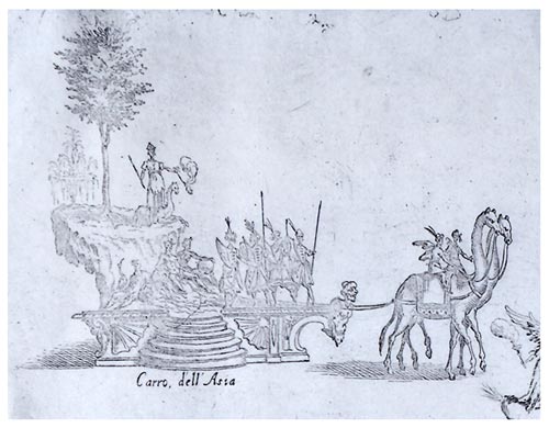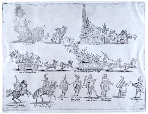 Pero no sería hasta 1637 cuando la fiesta aparecería como el elemento principal para manipular la opinión pública. El Conde Duque pretendía, a través de mascaradas (donde las numerosas carrozas creadas por Lotti brillaron especialmente), justas, danzas, representaciones, pompas… celebradas con motivo de la elección de Fernando III como Emperador y la entrada en España de la princesa de Cariñan, demostrar el poderío español ante la difícil situación con Francia. Los costes económicos fueron inmensos, ya que solamente las tramoyas diseñadas por Lotti, que permitían trece cambios de escenario en tan sólo una hora y media, costaron 6.000 ducados, pero el efecto fue el deseado, y el embajador inglés aseguró “que entre los romanos no se conoció ostentación mayor”.