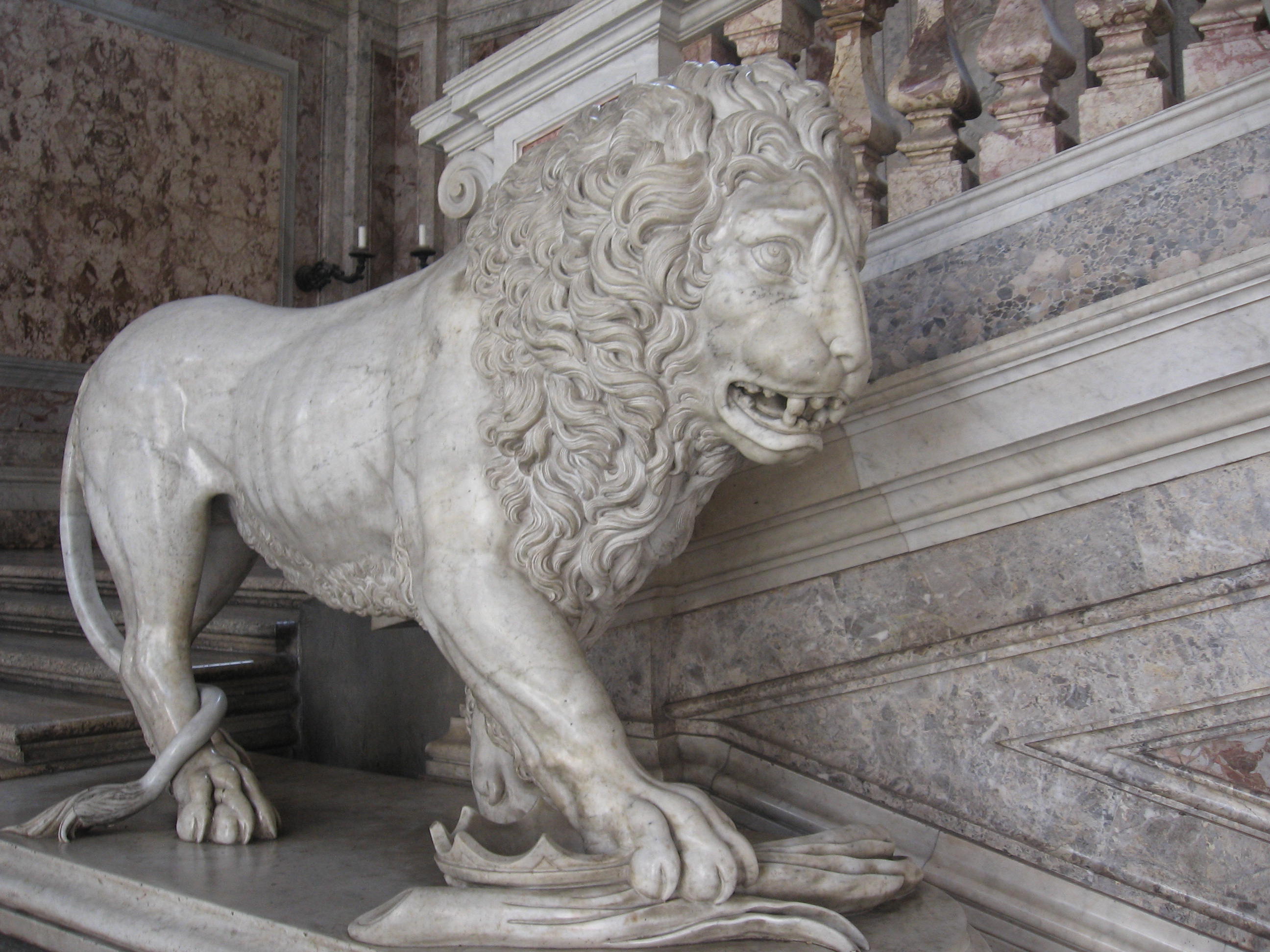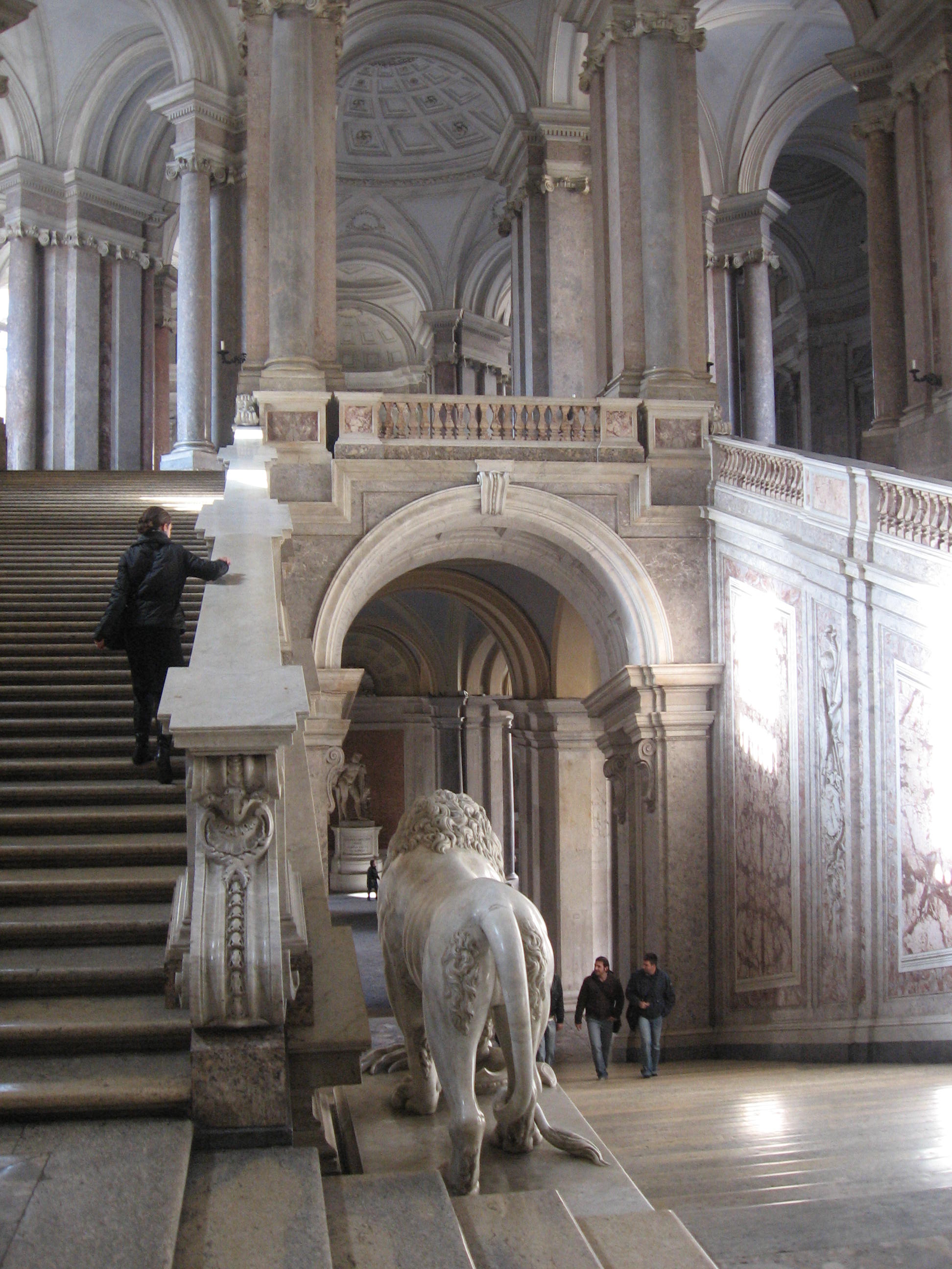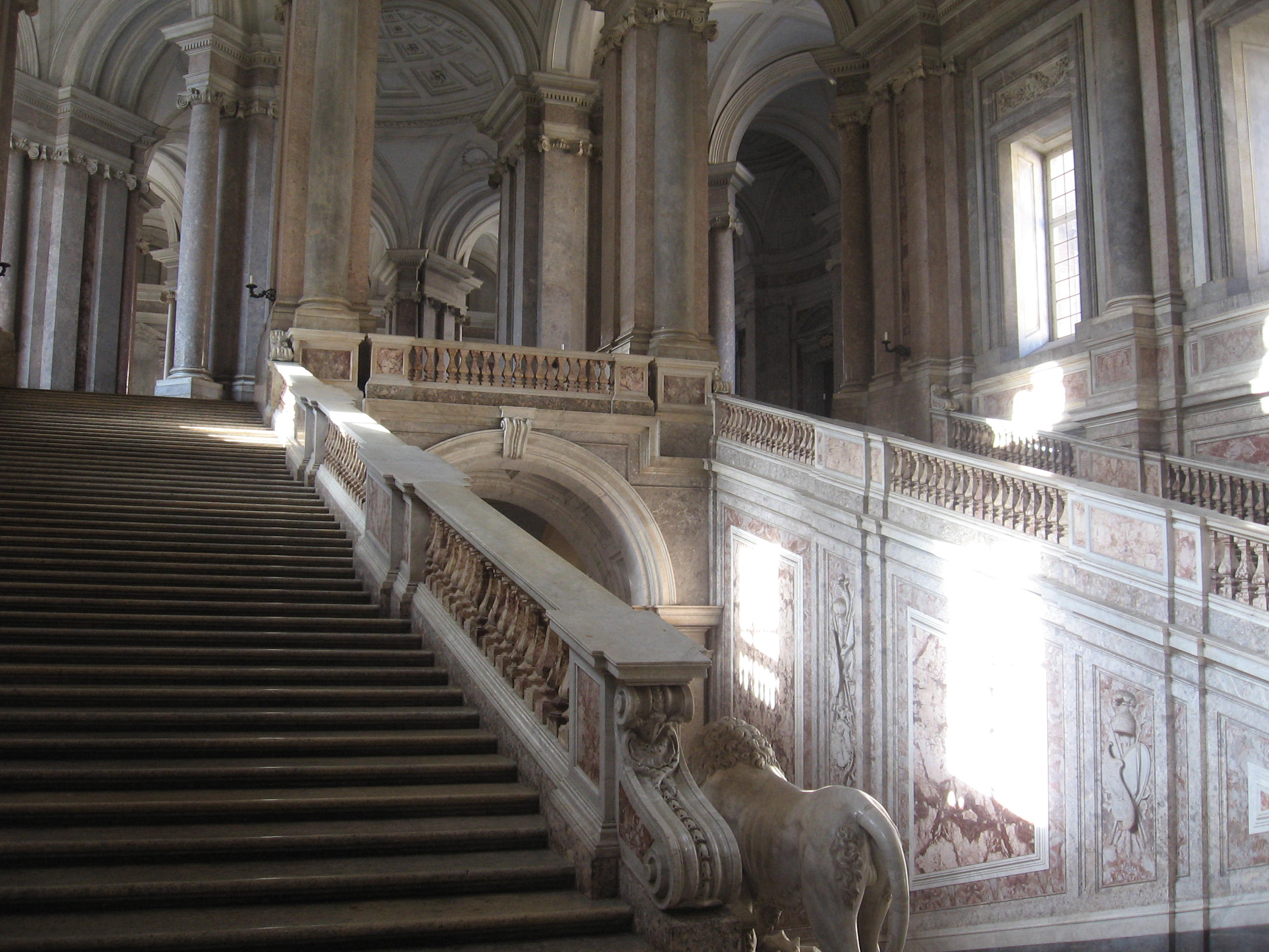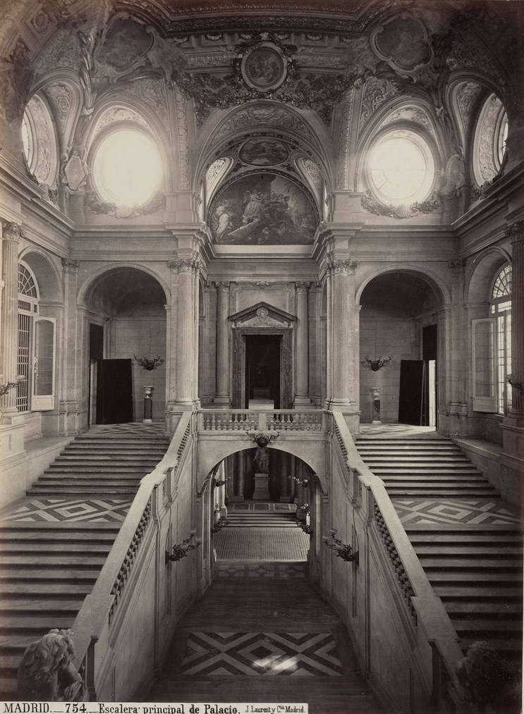 «Las escaleras principales, según el proyecto primitivo, debían ser dos, una enfrente de otra en el pórtico referido, que corre desde el atrio mayor al patio. Hiciéronse en efecto las caxas de ambas entera mente iguales, dexando en el intermedio un salon independiente, que solo había de servir para bayles, y funciones. Si el edificio fuese tan grande, que no hubiese dolido el perder terreno, esta distribucion le hubiera dado una apariencia magnífica; pero notándose despues de venido el Rey, que bastaba una sola escalera, y que cerrándose la de mano derecha, y formando de su caxa un salon, era facil dar ingreso mas cómodo, y mas grandioso á su quarto, y al del Príncipe, se executó así. Las subidas que estaban ideadas con varios derrames, eran algo penosas; y para evitar este defecto, buscó D. Francisco Sabatini arbitrio de hacer sumamente suave la de la única escalera que se dexó; la qual consiste en un tiro hasta la mesa, ó descanso, que hay á la media altura, y en otros dos que vuelven paralelos, y suben al descanso, donde está la puerta del salon de Guardias, que era el destinado para funciones, desde donde se pasa al que se hizo para caxa de escalera, que da entrada á los quartos del Rey, y del Príncipe, pudiendo tambien servir para funciones. […] dos leones de marmol blanco encima, uno de los quales, que es el de la derecha subiendo, lo hizo D. Roberto Michel, y el de la izquierda D. Felipe de Castro».