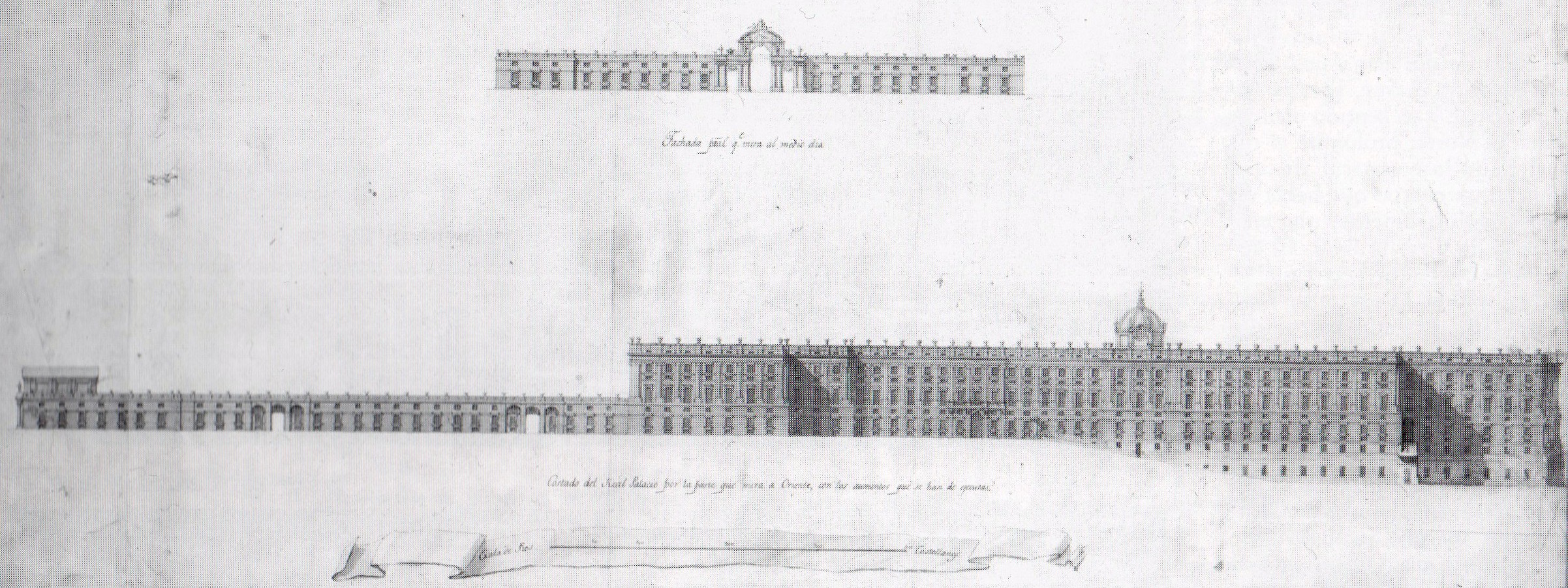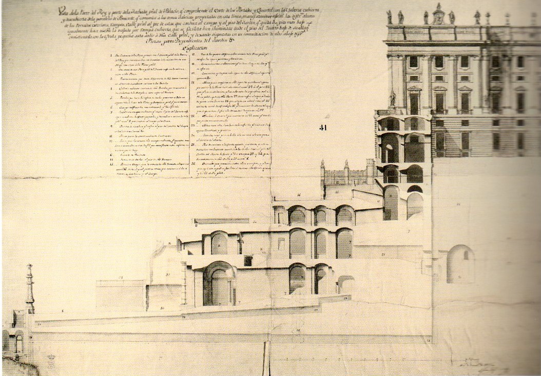 «Murió á este tiempo Juvarra, y quedó en su lugar D. Juan Bautista Saqueti, su discípulo, natural de Turin, que sujetándose á la voluntad del Rey en quanto al sitio, y extensión, y en quanto á que toda la obra fuese de fábrica, sin más madera que las de ventanas, y puertas, para libertarse del temor de otro incendio, formó nuevos dibuxos, y modelo, imitando á su maestro en el estilo. La misma irregularidad del terreno concurrió á facilitarle arbitrios para cumplir la orden, que se le dio tambien, de que dentro del recinto prefixado depusiese aposentamientos, no solo para las Personas Reales, que entonces eran muchas, y para los Señores, Secretarías, y familia, que deben alojarse en Palacio; sino también para todos los oficios de la Casa Real».