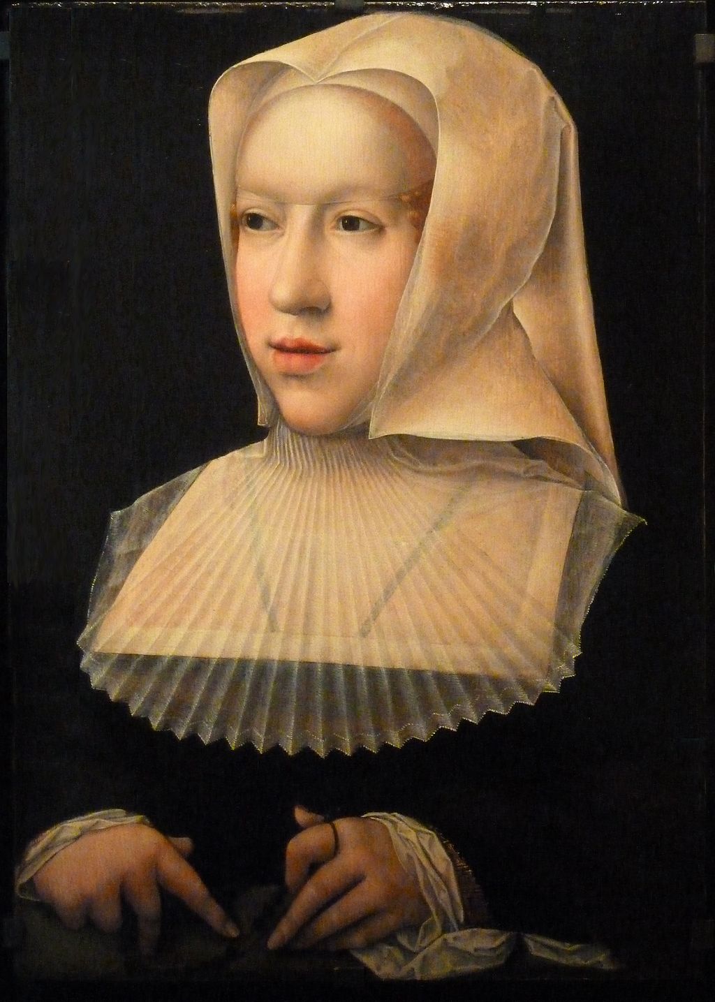 Tras la abdicación de su hermano Carlos y el retiro de éste a Yuste en 1555, María decide abandonar su cargo de gobernadora de los Países Bajos y se instala en España junto a sus hermanos Carlos V y Leonor. Las sucesivas muertes de sus hermanos Leonor y de Carlos en 1558 provocaron en María una profunda melancolía y con ello decayó su salud. Para animarla -y también porque la necesitaba con urgencia- Felipe II la convence de regresar a los Países Bajos y hacerse cargo nuevamente de la gobernación. María aceptó la petición de su sobrino; pero falleció en la ciudad de Cigales, el 18 de octubre de 1558, apenas unas semanas después que su hermano Carlos I. Es en las obras inventariadas a la muerte de María y que debían de pasar a Felipe II donde nuevamente tenemos noticia de la pintura: «Yten vna tabla grande, con dos puertas que se çierra, y en ella vn honbre e vna muger que se toman las manos, con vn espejo en que se muestran los dichos onbre e muger, y en las puertas las armas de don Diego de Guebara, hecha por Juanes de Hec año 1434».