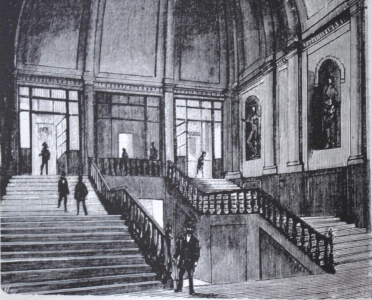 Entre los primeros descuella el estenso convento é iglesia que fué de los padres trinitarios calzados, cuya traza dio de su propia mano Felipe II, señalando él mismo el sitio que ocupa, que con sus accesorios comprende nada menos que 108.646 pies. Su construcción, que principió hacia los años de 1547, corrió a cargo del arquitecto Gaspar Ordoñez. De la iglesia (que era muy espaciosa y decorada) no puede juzgarse ya, por las notables alteraciones y córtes que se la han dado en estos últimos años, y conforme á los nuevos destinos que recibió este edifico despues de la esclaustración en 1836. Convertida primero en teatro y salones de la sociedad llamada del Instituto español, luego para las Esposiciones de pinturas y para el Conservatorio de artes, hoy está en gran parte ocupada por éste, y otra parte sirve de ingreso al claustro y escalera principal. Estos permanecen todavía en estado primitivo, y por su buena forma y gusto recuerdan, especialmente la escalera, al monasterio del Escorial. El espacioso convento […] fue destinado después á reunir en él la gran colección de cuadros recogidos de las iglesias y conventos de la provincia y otros, bajo el título de Museo Nacional, y hoy, sin suprimirse aquél, le ocupan, simultáneamente, y por cierto con estraña amalgama, las oficinas del Ministerio de Fomento; habíendose hecho necesarias para ello costosas obras de distribución.