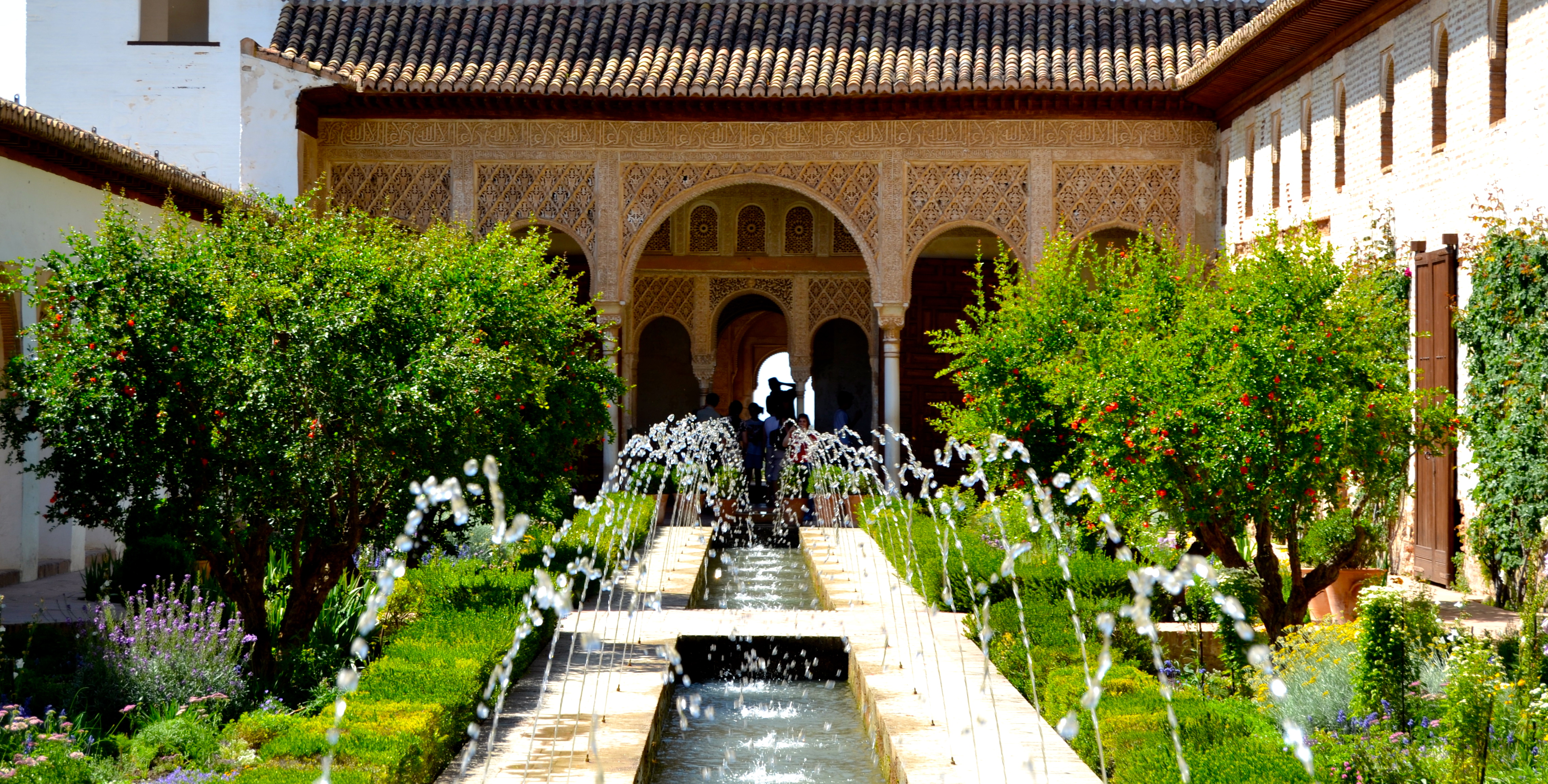 Imagen actuales de los Jardines del Generalife de la Alhambra de Granada. Wikimedia Commons.