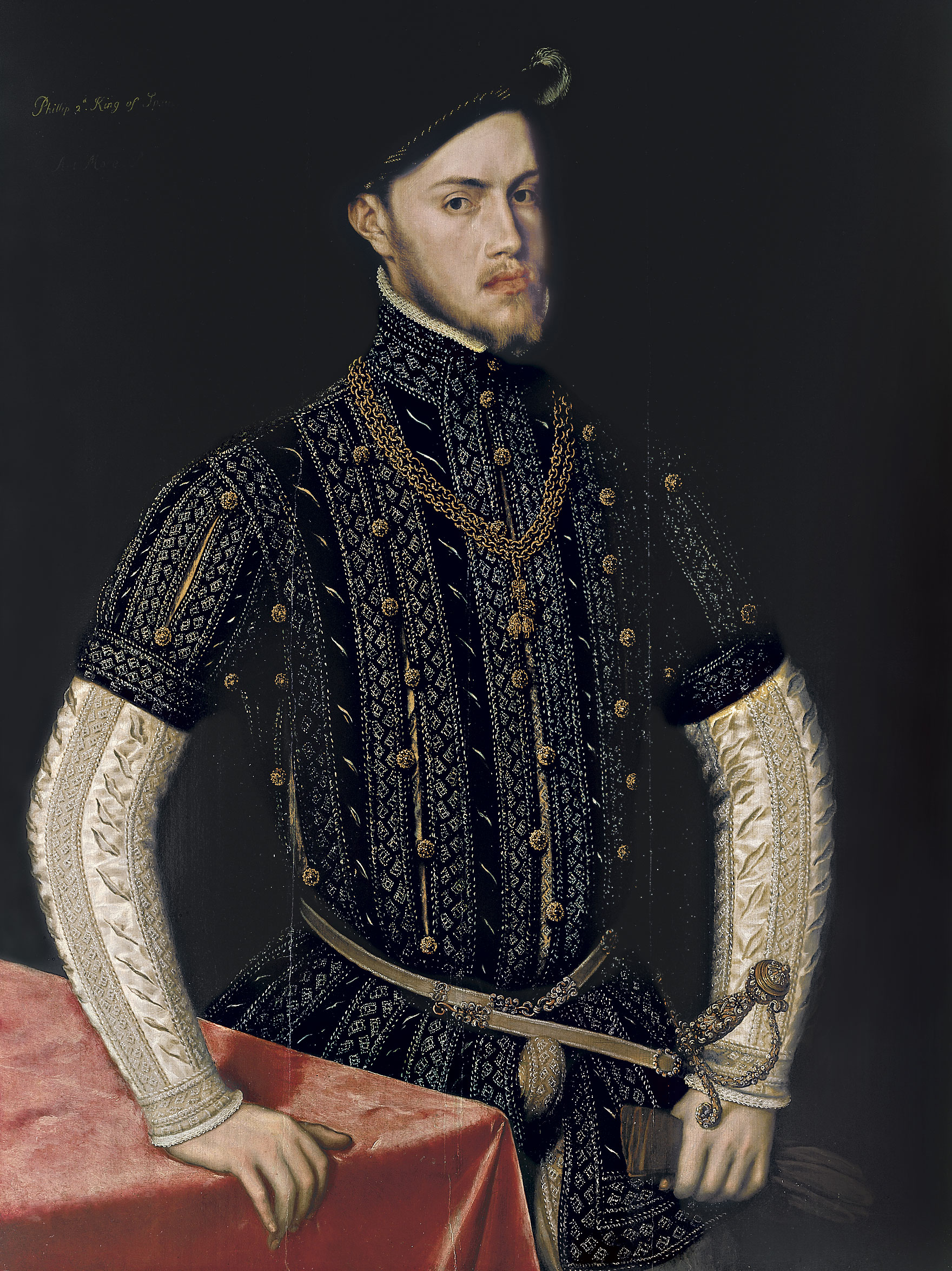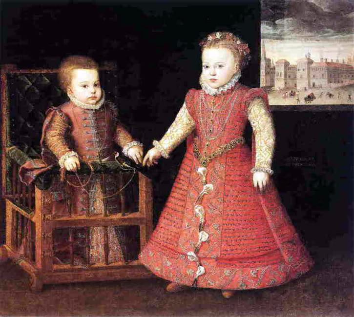 Isabel era la hija mayor de Felipe II pero aún así no era la heredera al trono de España ya que desde el cuarto de matrimonio de su padre con Ana de Austria, en 1570, ésta dio a luz a una sucesión de varones de los que sólo sobreviviría el futuro Felipe III. En un retrato grupal de alrededor de 1584 vemos a las dos hijas mayores de Felipe II ante el monarca y acompañando a su hermano pequeño que se muestra como el sucesor de la corona hispánica.
