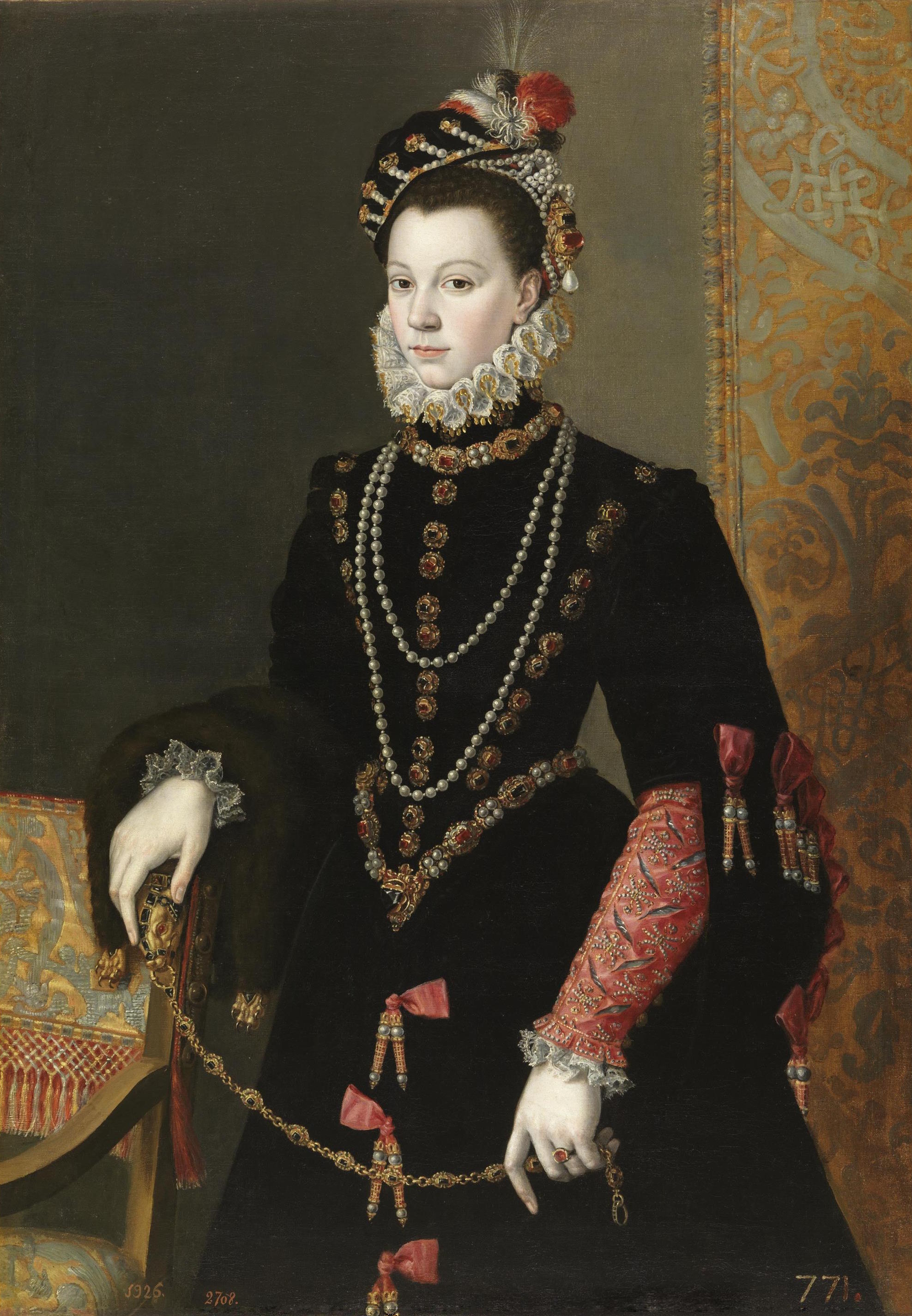 Hacia 1579 Alonso Sánchez Coello realizará el primer retrato de Estado que conservamos de la infanta. Con tan sólo trece años, está aparece representada de pie, apoyando el brazo derecho en el respaldo de un sillón y la mano izquierda sujetando un pañuelo. En la cabeza lleva un tocado de perlas rematado con una piocha de plumas. Luce un rico atuendo en blanco, bordado en oro, y con numerosas botonaduras y apliques de oro, perlas y piedras preciosas. Siguiendo la tendencia del retrato veneciano, el artista dió suma importancia a las texturas de los ropajes y los aderezos de joyería.