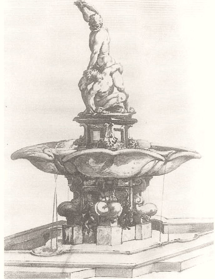 Pero comencemos por el principio, la pieza en cuestión, es la única escultura de proporciones monumentales de mármol realizada por Giambologna (Jean Boulogne, 1529-1608) que se conserva fuera del ámbito italiano. Este autor trabajó principalmente en la corte florentina de Francisco I de Medíci (1541-1587) quien le encargaría esta obra antes de 1562, año en que aparece citada ya en la documentación. Posteriormente, en 1569, se realizaría el diseño del pedestal, basa y pila para colocarlo como fuente ornamental en alguna de las villas o palacios mediceos, seguramente en los parterres del Casino que el Gran Duque tiene en los giardini dei Semplici, junto al convento de San Marcos en Florencia. En el gabinete de dibujos y estampas de la Galería Uffizi se conservan dos dibujos del diseño de la fuente, seguramente uno sea el diseño original y el segundo más esquemático sea un dibujo enviado a España con las medidas de las piezas para poder ser instaladas cuando se utilicizase la fuente como regalo diplomático por parte de Fernando I.