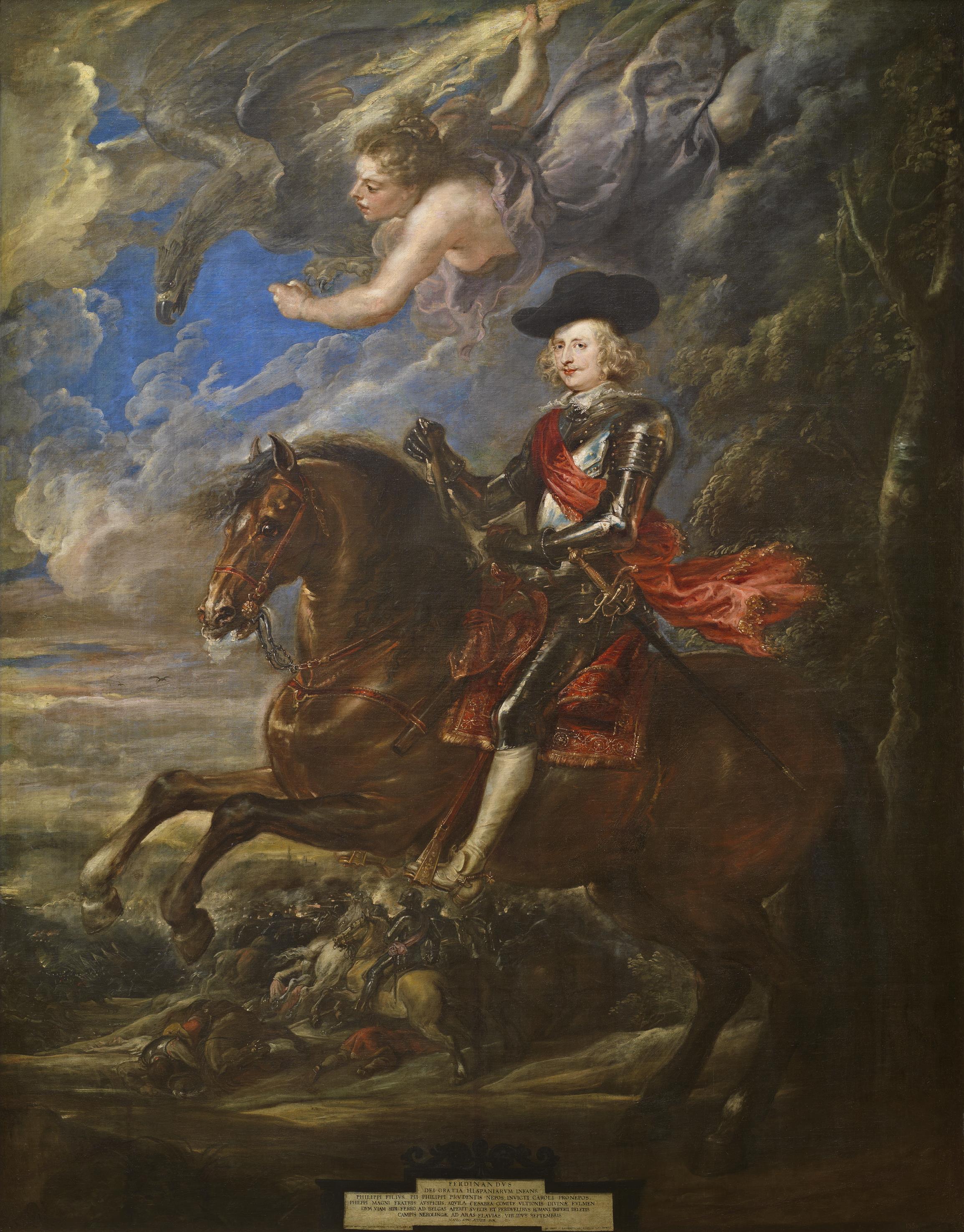 El encargado de dar vida a esta iconografía de Carlos II será Sebastián Herrera Barnuevo, a quien nuestro compañero Cipri lleva dedicando sus investigaciones muchos años y sobre el que podéis leer algunos interesantes post aquí, y que obtendrá el nombramiento de pintor de cámara en 1667 tras el fallecimiento de Martínez del Mazo. Herrera Barnuevo se servirá consecutivamente de dos modelos. Primero del retrato ecuestre de Baltasar Carlos creado por Velázquez para el Salón de Reinos y cuando el príncipe ya tenga algo más de edad del pintado por Rubens al Cardenal Infante Fernando de Austria en la batalla de Nördlinguen, realizado hacia 1634.