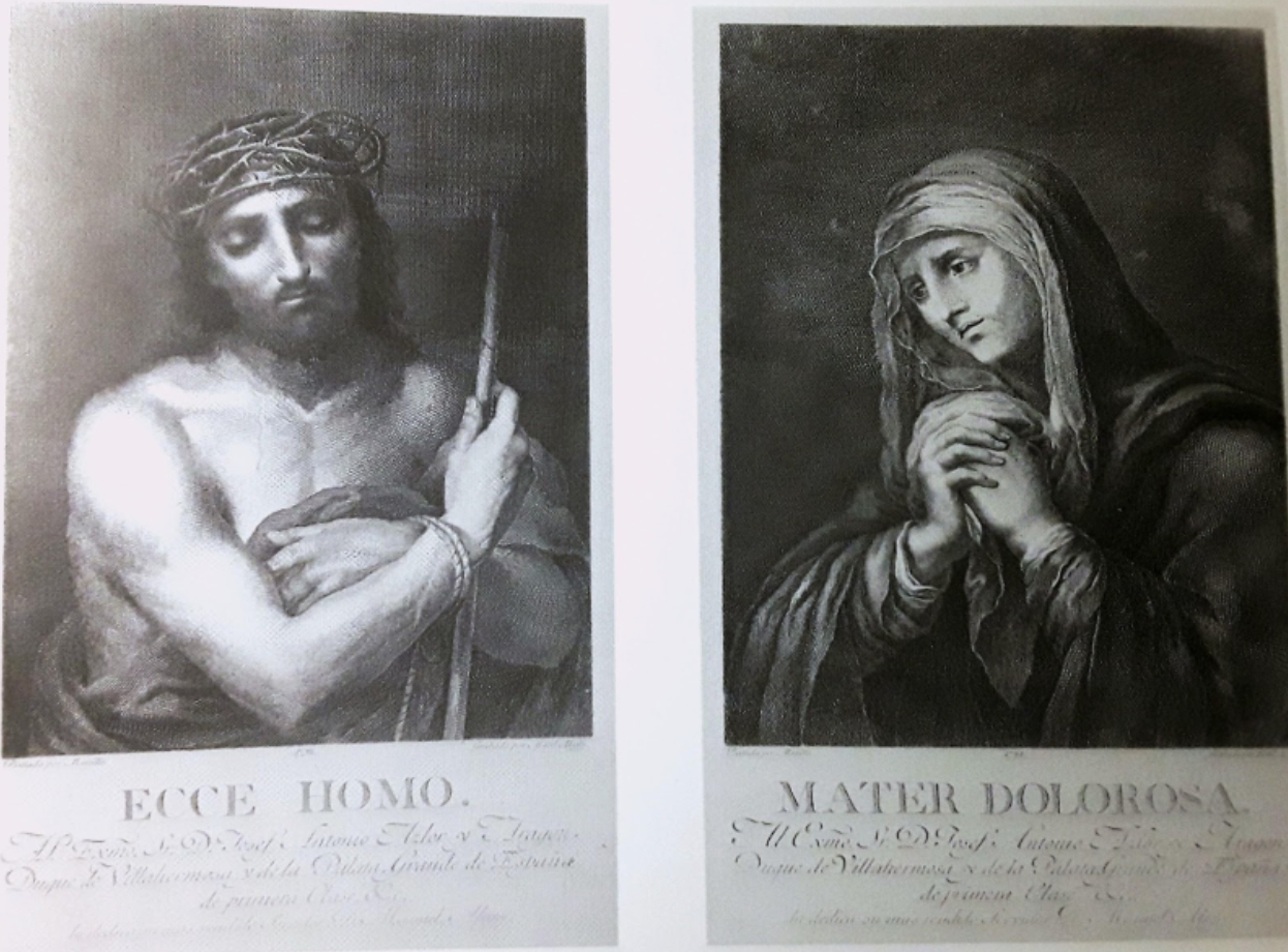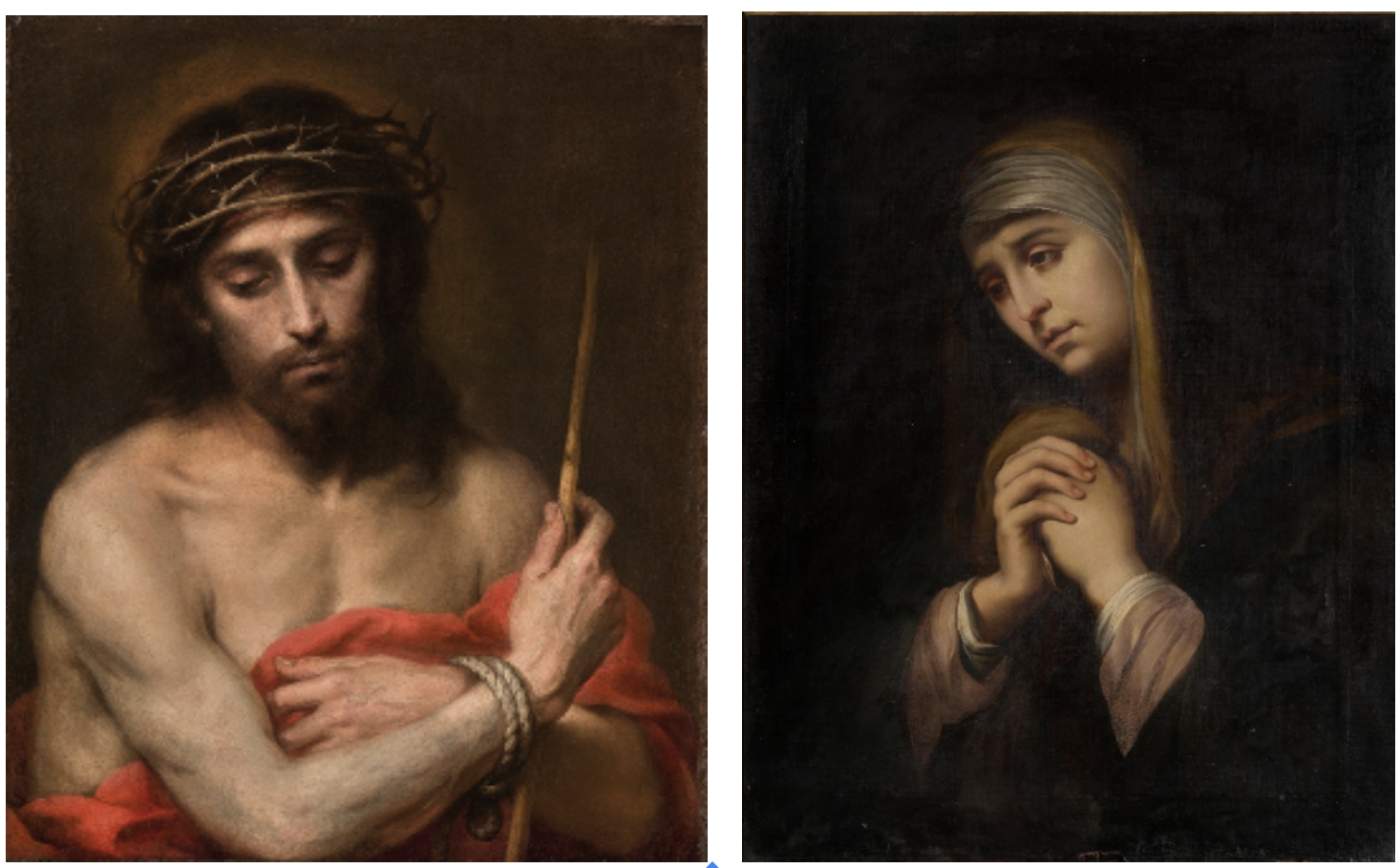 Estas imágenes dobles de Cristo Varón de Dolores o Ecce Homo y Mater Dolorosa van a ser frecuentemente encargadas a Murillo y su taller, para el consumo de fieles dentro de los ambientes posconciliares. Una de sus obras más afortunadas es la del Ecce Homo que perteneció al duque de Villahermosa en el siglo XVIII. En ella el sufrimiento de Cristo queda reflejado en la cadencia de la cabeza con los ojos humillados y la resignación cristiana. Ésta se completaba con una Mater Dolorosa, ahora en paradero desconocido, pero que conocemos por un grabado del siglo XVIII de la Biblioteca Nacional y por una copia del siglo XIX del Museo del Prado.