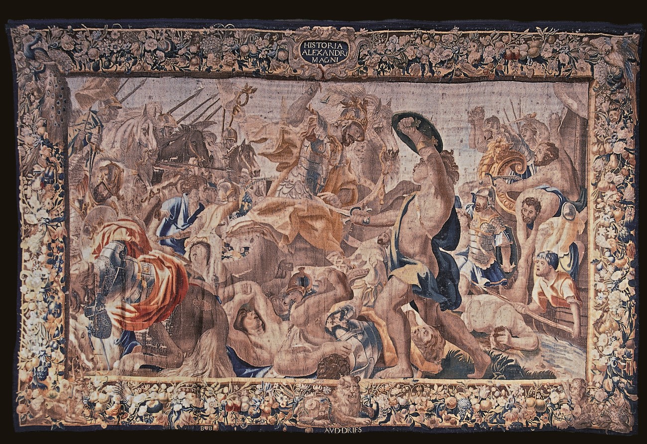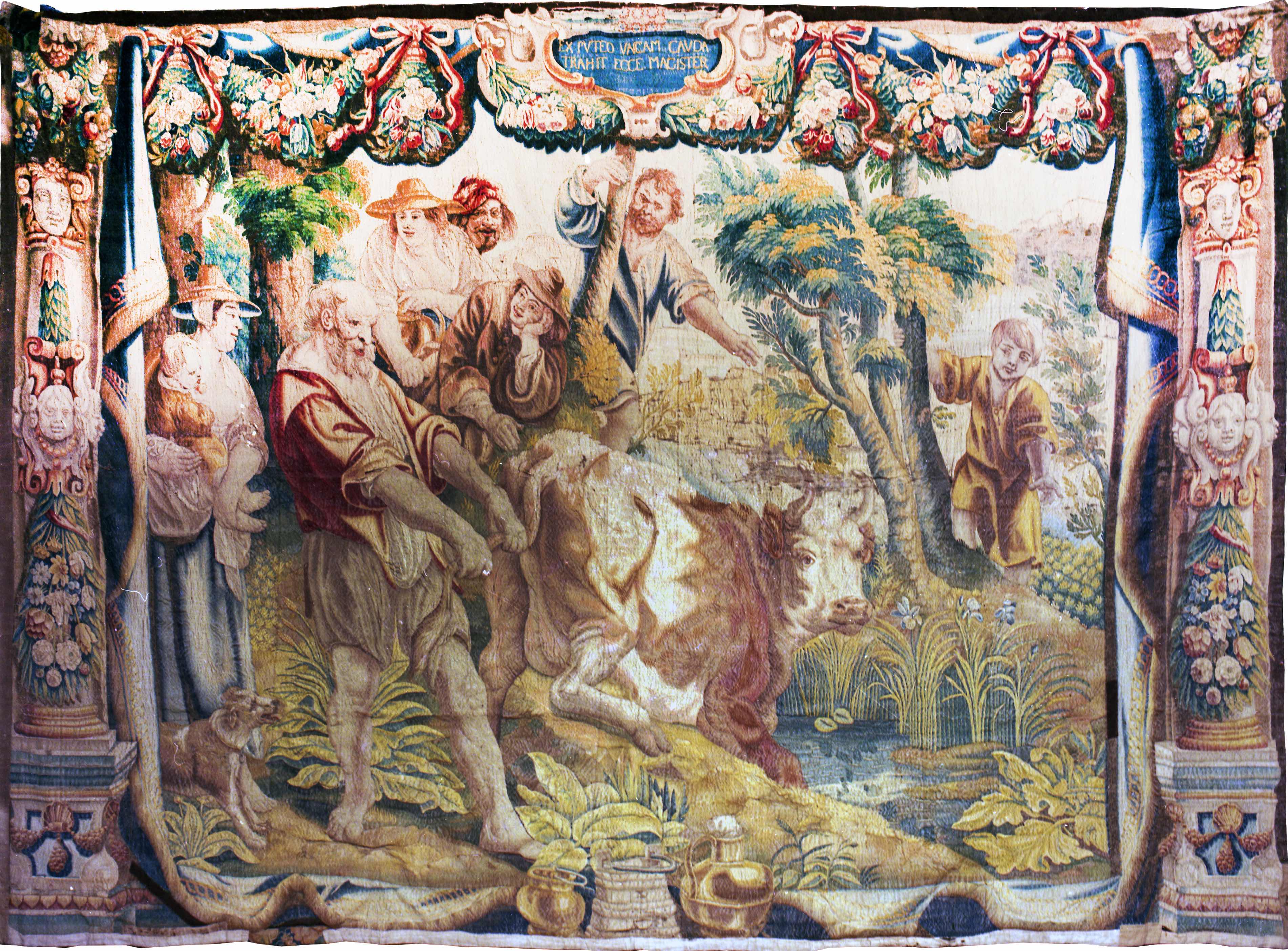 Jacob Jordaens (1593-1678) va a trabajar toda su vida en Amberes, su ciudad natal. Es un pintor atípico en el sentido en el que no tuvo la necesidad de viajar a Italia, como gran parte de sus colegas. Sus composiciones deben mucho a la influencia flamenca y la tradición septentrional, que asume no sólo a través de sus maestros, sino también a través de la literatura y el folclore neerlandeses. Fue un pintor que se forma en el taller de Adam van Noort (1562-1641), de quien llego a ser su yerno. En 1607 se inscribe como maestro en la guilda de pintores. Lo hace como “waterschilder”, es decir, acuarelista. Una denominación habitual entre los pintores que se dedicaban a realizar cartones para tapices. De hecho, esta fue una tarea que Jordaens va a realizar a lo largo de toda su vida, y donde más destaca su producción. De hecho, en estas series para tapices, Jordaens demuestra un sólido conocimiento de las fuentes literarias, tanto clásicas como contemporáneas, por lo que sus obras tienen una lectura mucho más profunda de la que aparentemente parecen. Los diseños que realizó para los talleres de tapices más importantes, tanto de Bruselas como de Amberes, muestran una elaboración cuidada de unos temas destinados a decorar los palacios y casas burguesas más adineradas de la Europa del siglo XVII. En la Vida de Alejandro, o la serie de tapices de la Escuela de Equitación con Mercurio y Marte dando lecciones al jinete, Jordaens muestra cómo trabaja los temas clásicos. En cambio, en los Proverbios, o la dedicada al Arte de la caza como entrenamiento para el Amor, Jordaens recurre a los refranes flamencos y composiciones tradiciones para sus composiciones. Por tanto, el arte de Jordaens no sólo llega a España de forma directa, sino también indirecta a través de estas composiciones bordadas.