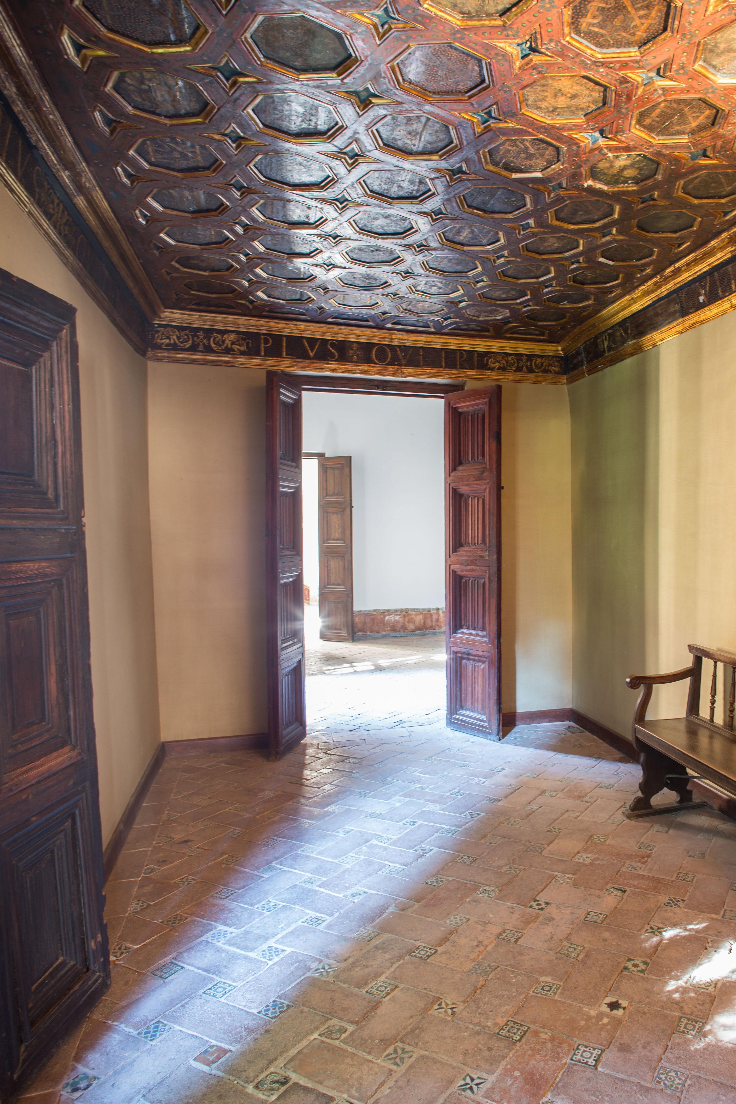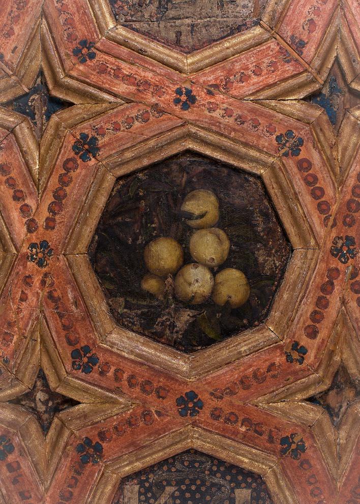 Las “Salas de las frutas” en la Alhambra, conocidas así las dos salas desde el siglo XVI por los frescos de sus techos, formaban parte de las estancias residenciales que se mandaron construir tras la luna de miel de Carlos V y la emperatriz Isabel, quienes se alojaron en la Alhambra. Enmarcados en octógonos, encontramos frutos secos, frutas, flores y hortalizas propias de tierras granadinas como almendras, granadas o berenjenas. El conjunto sugiere una interpretación independiente de cada representación, lo que podría significar la primera serie de bodegones españoles. Sus autores fueron los pintores Julio de Aquiles y Alejandro Mayner, traídos de Italia por Francisco de los Cobos, quienes trabajaron juntos en la Alhambra entre 1536 y1537, y cuyas decoraciones se han puesto en relación con los grutescos del estudio de Rafael[11]. Esta tradición de decorar en grutescos se mantuvo viva durante décadas, y vemos como ya a finales del siglo XVI y comienzos del XVII pintores como Pablo de Céspedes y Antonio Mohedano eran contratados para decorar claustros, techos y marcos de escenas narrativas con grutescos formados por bandas con ornamentos vegetales fantásticos que se entremezclan con paneles que muestran, de forma naturalista, ramas de árbol con frutas y pájaros[12].