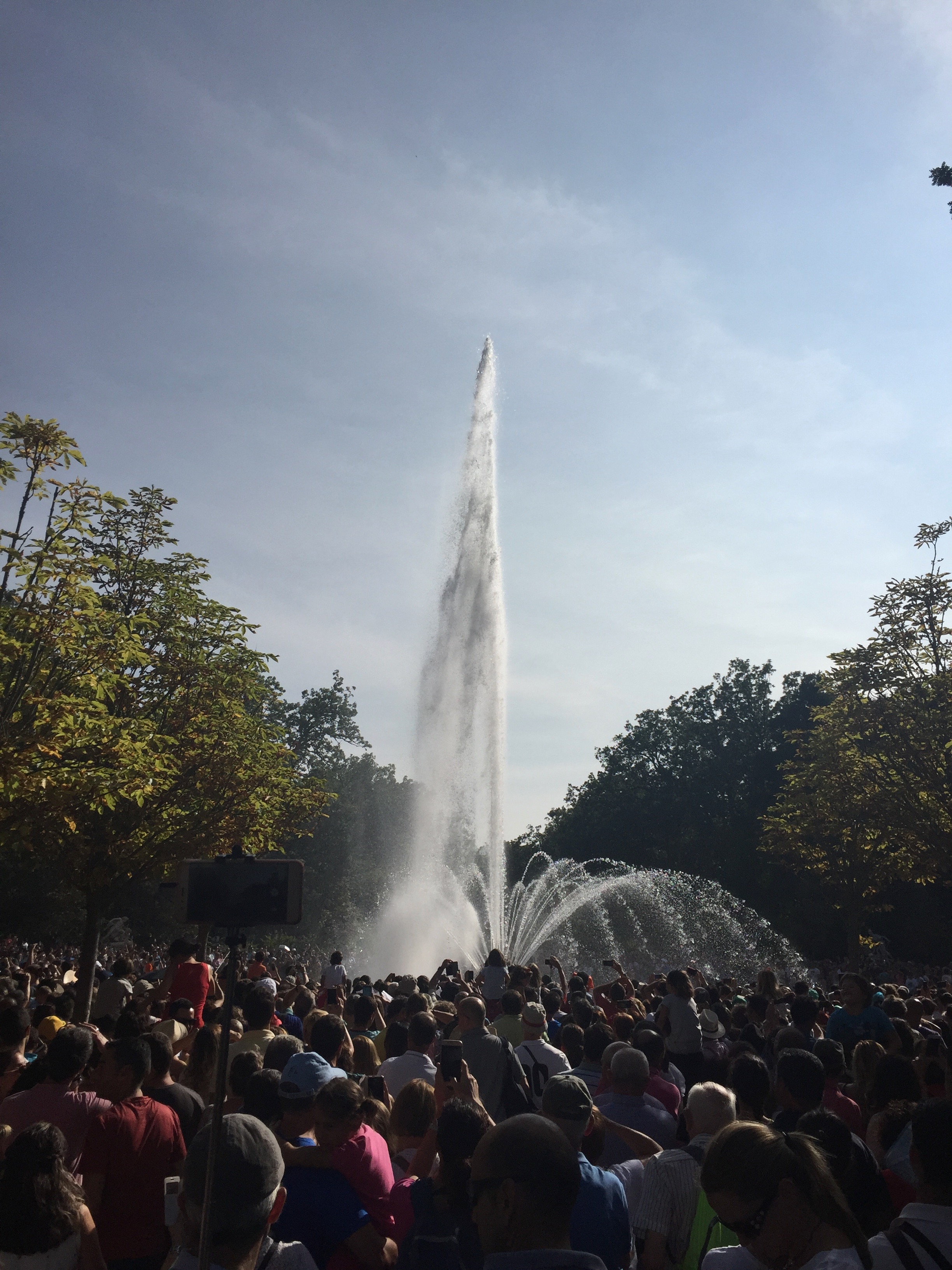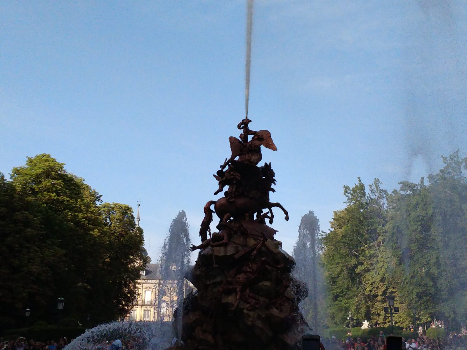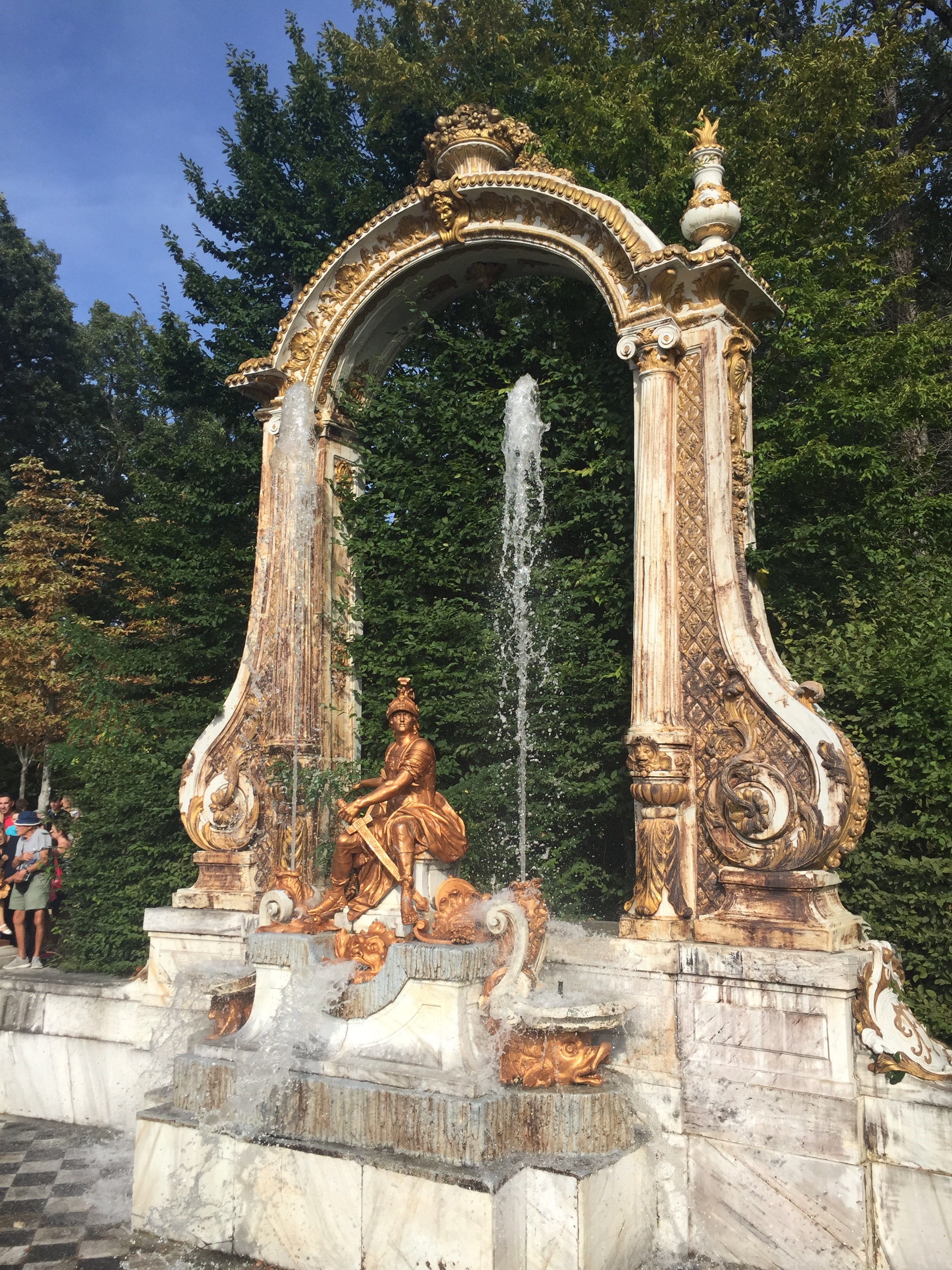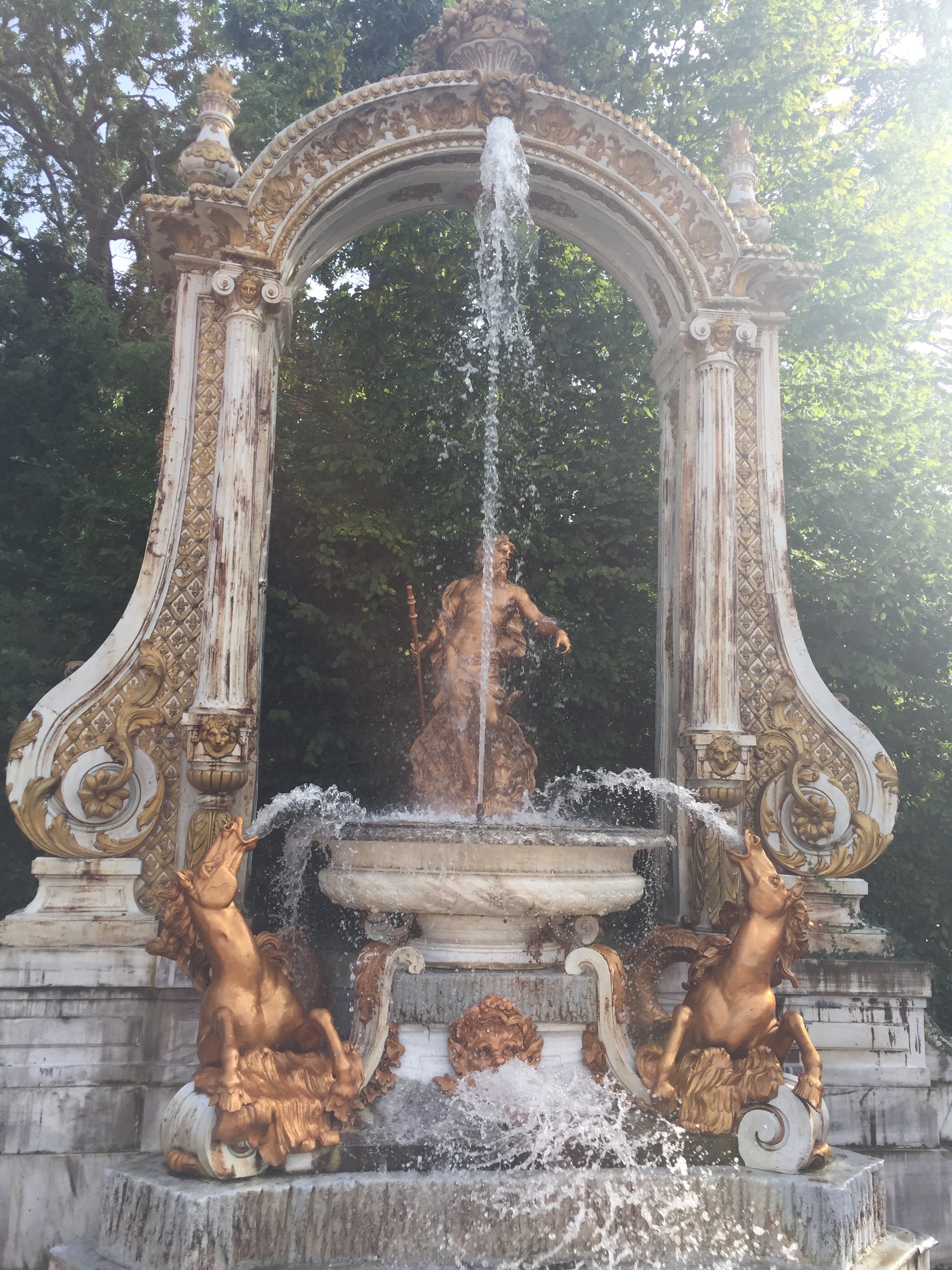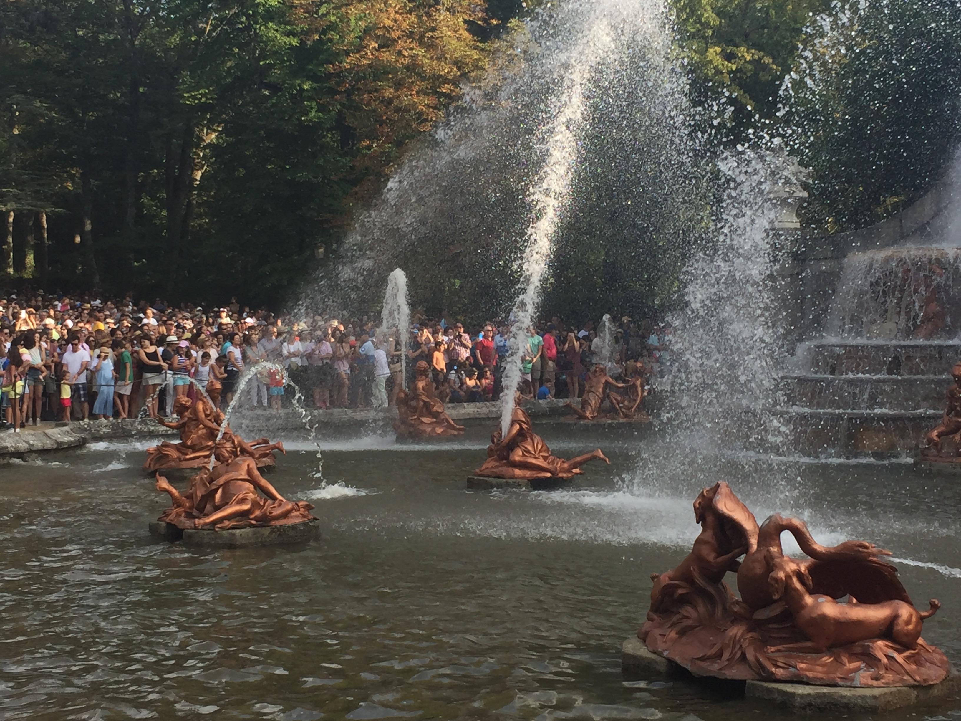 Este año hemos podido ir a disfrutar del espectáculo de las fuentes el 25 de agosto día de San Luis. Ese día, siete fueron las que se pusieron en funcionamiento. Todas no se ponen en marcha a la vez, sino que siguen un orden concreto. Se empieza a las 17:30h en la fuente de la Selva, dejando correr cada una unos 10 minutos; se continúa con la maravillosa «Carrera de los Caballos»; de ahí se pasa a la «fuente del Canastillo» (ojo, si te pones cerca es seguro que te empapas de agua); la siguiente son las serenas ocho fuentes en las «Ocho Calles»; de ahí se pasa a nuestra preferida, la «fuente de las Ranas» (también es casi seguro que te mojarás si estas cerca de ella); la penúltima es la monumental de «los Baños de Diana»; y se termina hacia las 19.15h en la «fuente de la Fama» (en esta es importante observar la dirección del viento ya que si estás en el lado en el que cae el agua del alto chorro vertical terminarás hecho una sopa).