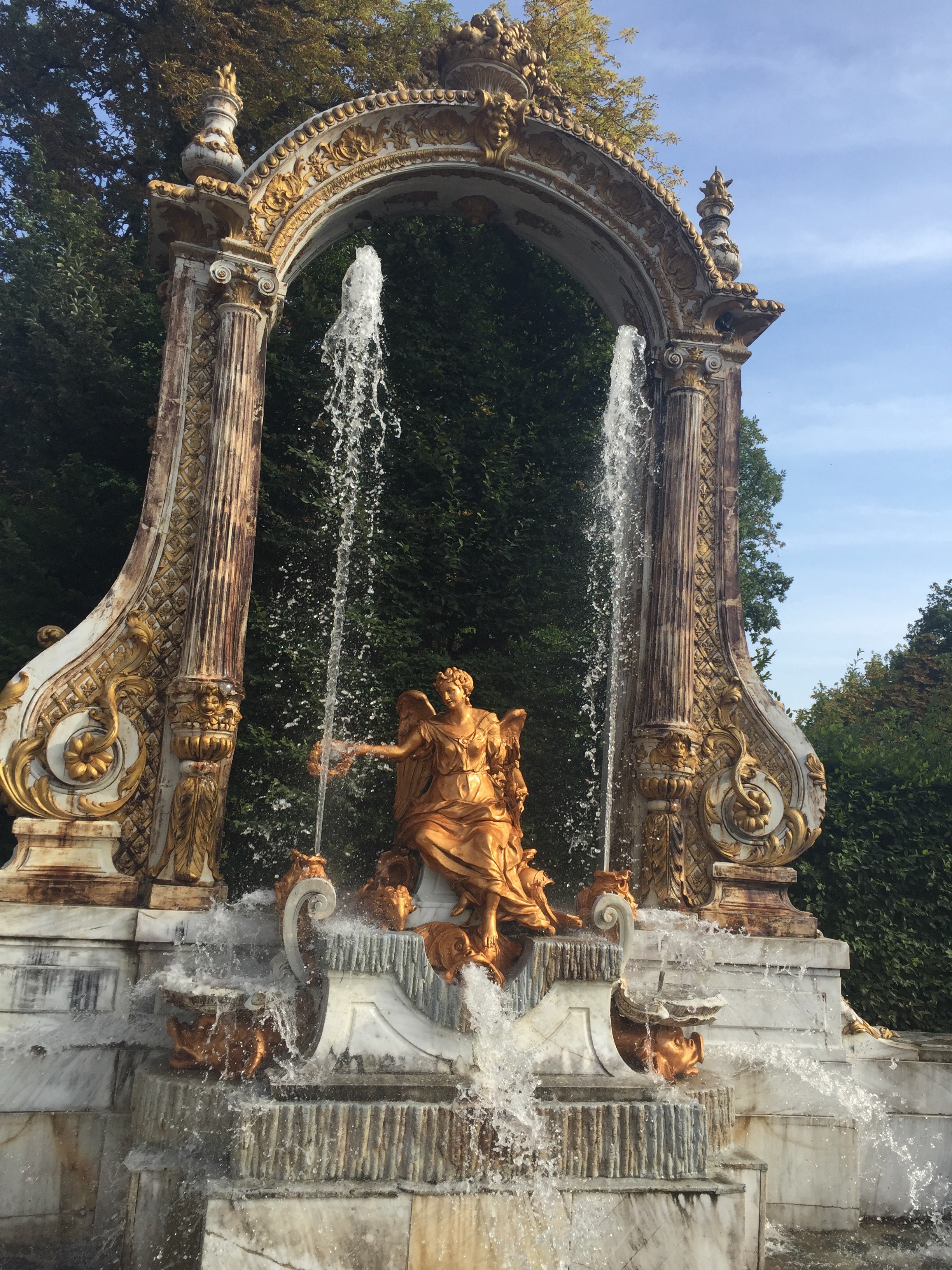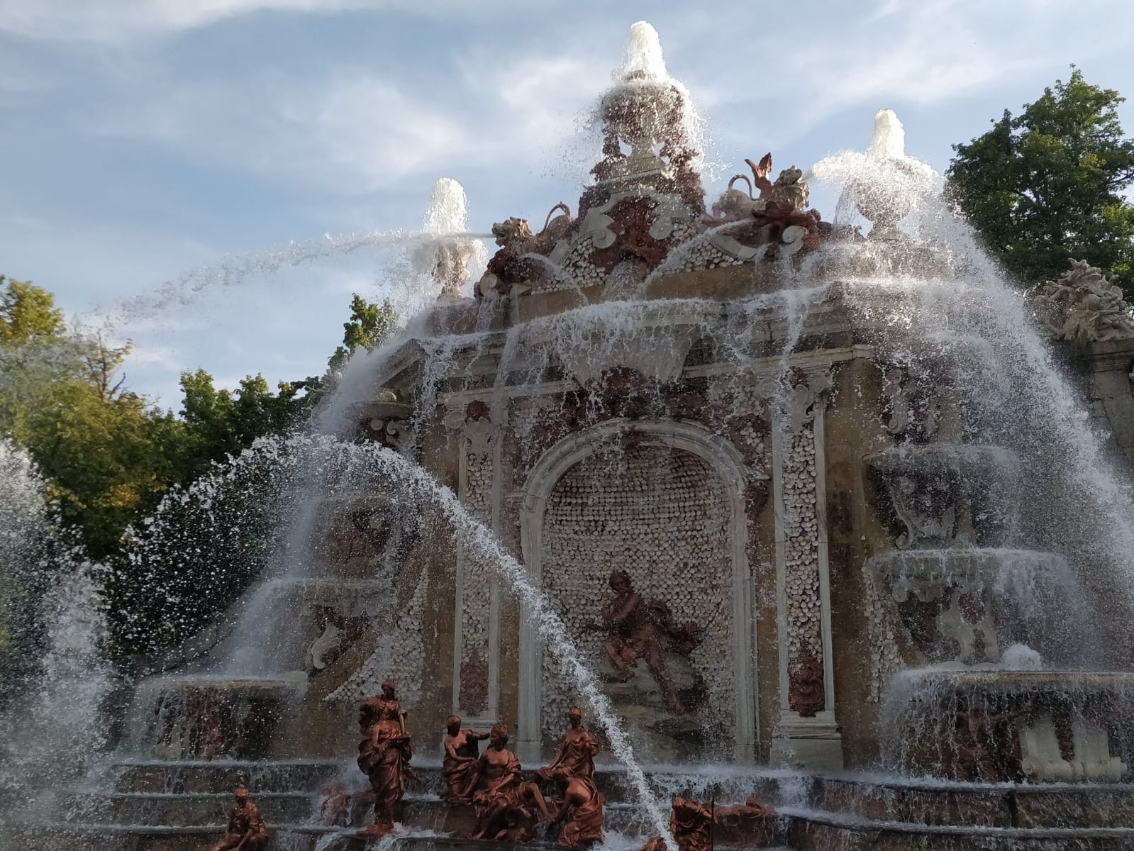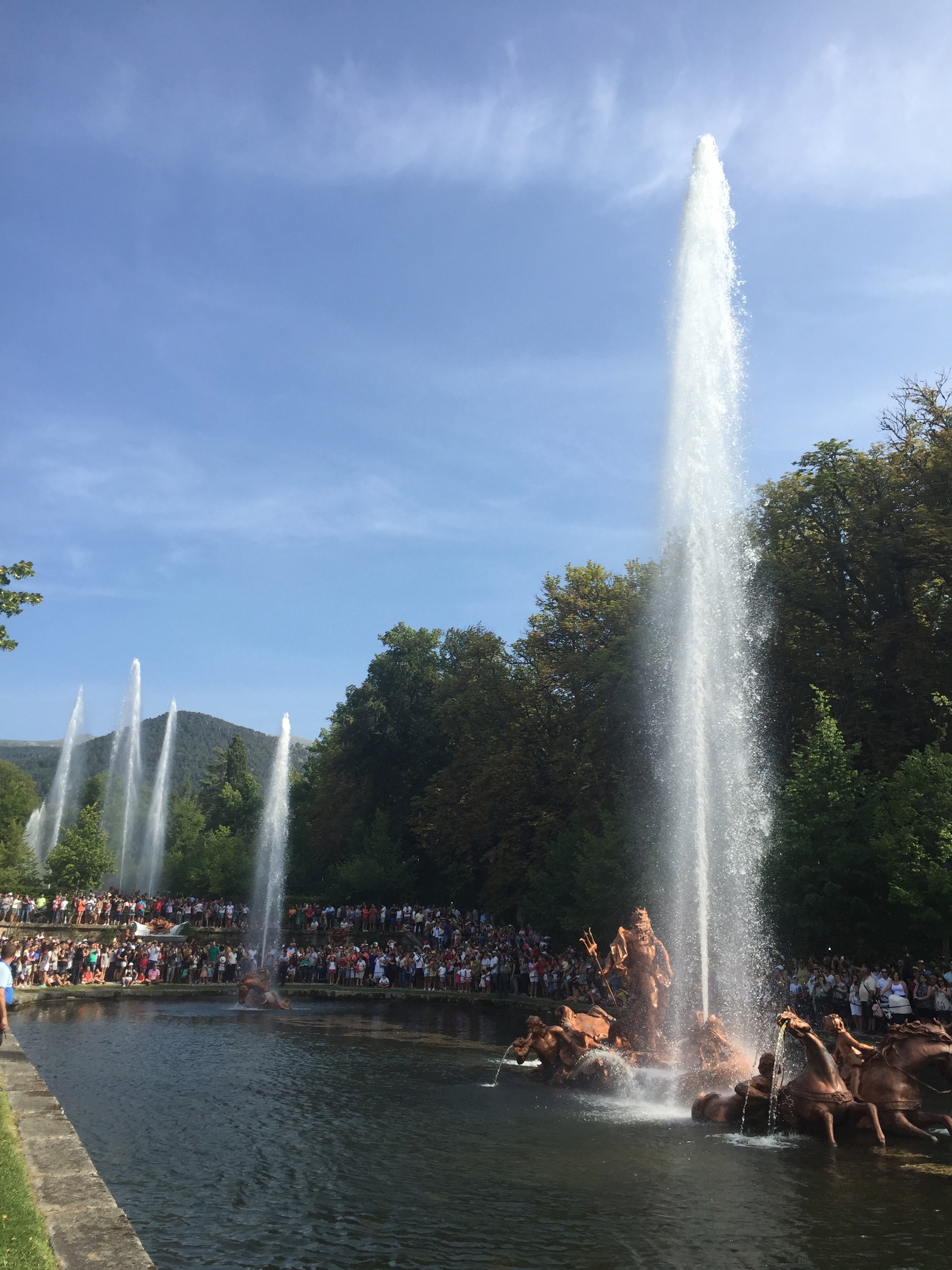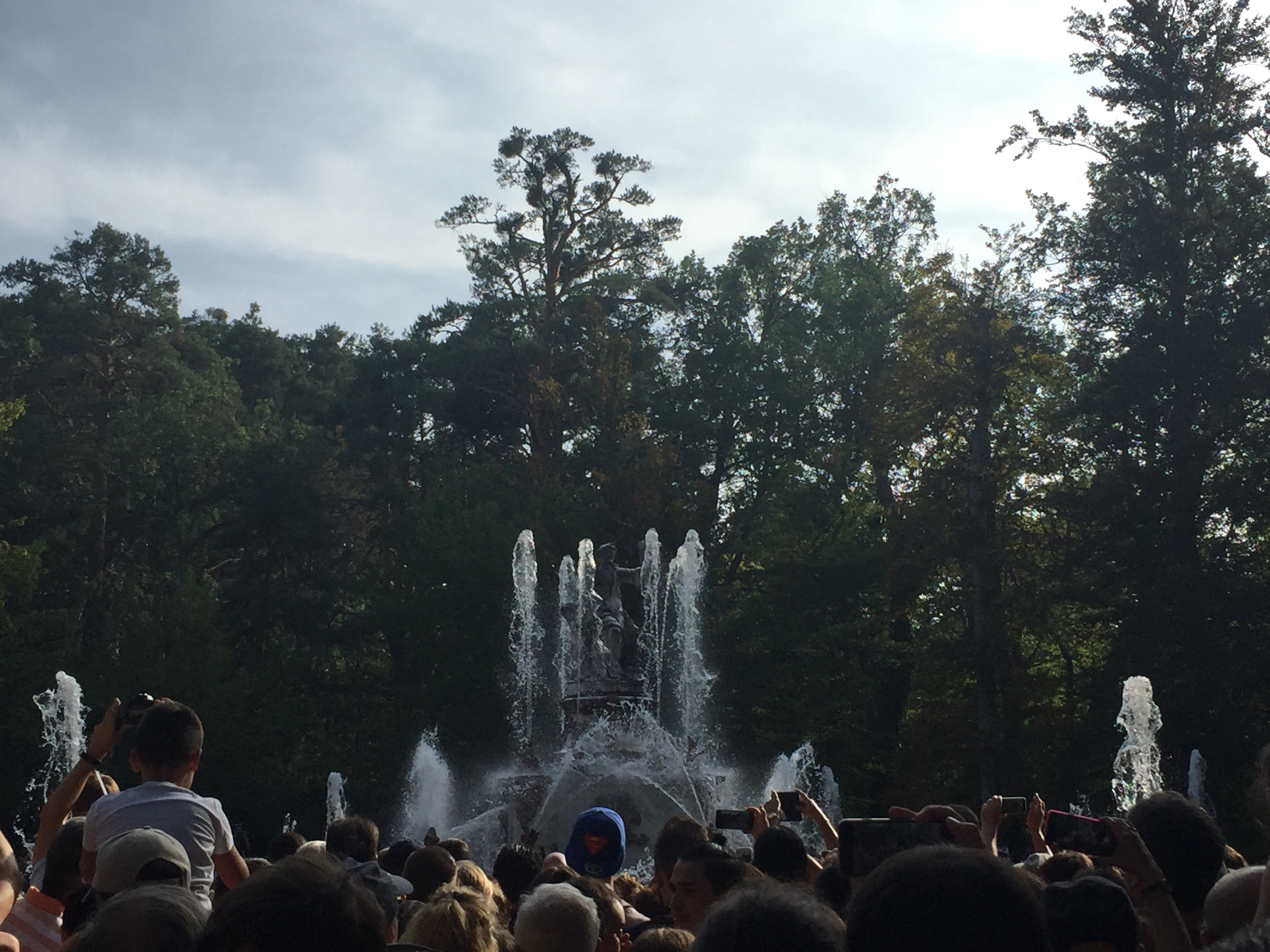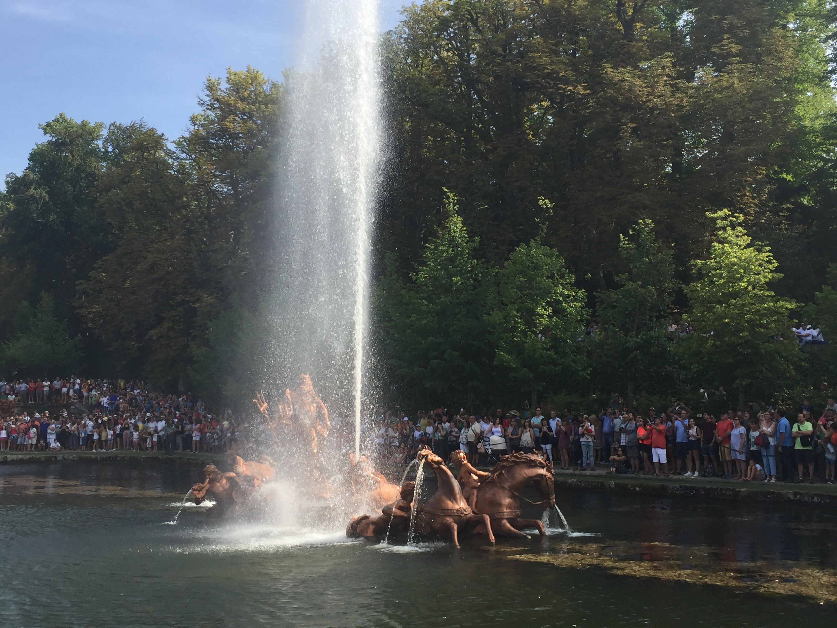 Este año hemos podido ir a disfrutar del espectáculo de las fuentes el 25 de agosto día de San Luis. Ese día, siete fueron las que se pusieron en funcionamiento. Todas no se ponen en marcha a la vez, sino que siguen un orden concreto. Se empieza a las 17:30h en la fuente de la Selva, dejando correr cada una unos 10 minutos; se continúa con la maravillosa «Carrera de los Caballos»; de ahí se pasa a la «fuente del Canastillo» (ojo, si te pones cerca es seguro que te empapas de agua); la siguiente son las serenas ocho fuentes en las «Ocho Calles»; de ahí se pasa a nuestra preferida, la «fuente de las Ranas» (también es casi seguro que te mojarás si estas cerca de ella); la penúltima es la monumental de «los Baños de Diana»; y se termina hacia las 19.15h en la «fuente de la Fama» (en esta es importante observar la dirección del viento ya que si estás en el lado en el que cae el agua del alto chorro vertical terminarás hecho una sopa).