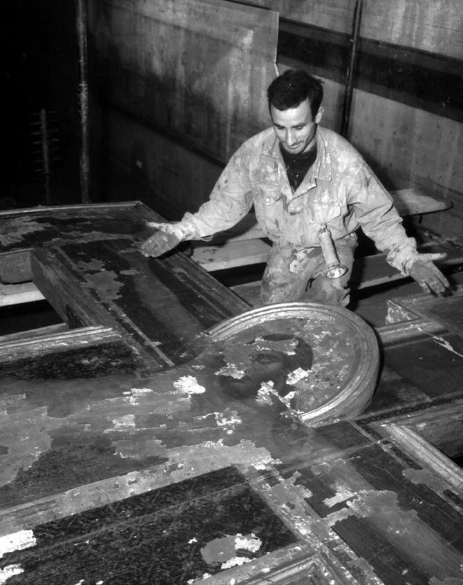Cientos de cuadros se vieron afectados durantes las inundaciones. Aquí extendidos para su secado en la galería superior de los Uffizi.