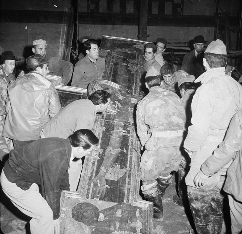 El 4 de noviembre de 1966 una enorme tromba de agua desbordó el río Arno en Florencia e inundó buena parte de la ciudad. Junto al agua del río también se desplazó una ingente cantidad de barro, piedras y ramas de árboles que se mezclaron con hidrocarburos haciendo que las consecuencias de la inundación fueran aún más dañaninas para las obras artísticas. La subida del nivel, que en algunos puntos llegó a los seis metros de altura, dejó entre Florencia y sus inmediaciones más de 100 personas fallecidas, se perdieron las casas de cinco mil familias y se dañaron o destruyeron miles de obras de arte. Se estima que entre tres y cuatro millones de libros y manuscritos sufrieron importantes daños y que unas 14.000 obras de arte fueron afectadas, en mayor o menor grado.