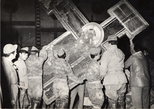 Los «ángeles del barro» sacando obras del interior de los Uffizi.