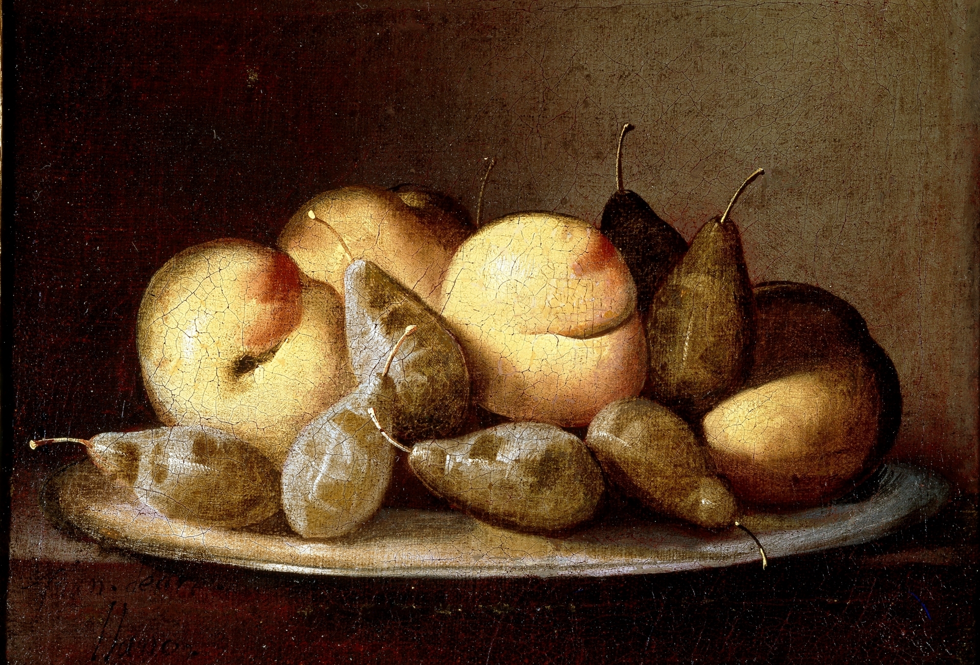 Otra de las personalidades más importantes y enigmáticas que surgen durante el primer tercio del siglo XVI en Madrid es Juan Fernández, artista que residía en el campo y solamente acudía a la ciudad de forma puntual para vender sus cuadros, por lo que fue conocido con el sobrenombre de El Labrador. A pesar de conservarse una única obra firmada, contamos con un importante número de atribuciones que nos permite clasificarle como uno de los artistas más emblemáticos del género. En contraposición a Van der Hamen, su obra se despoja de todo artificio y adelanta las frutas hasta un primerísimo plano, ocultando las posibles referencias espaciales y centrando nuestra atención en el simple fruto como producto de la naturaleza, que nos muestra de forma explícita[4]. Dichos frutos parecen recién sacados de su entorno, pudiéndose apreciar en sus racimos de uvas el hollín y el mosto a través de brillos y vivos colores, pero no deja de ser un engaño más, ya que dispone en los sarmientos, que cuelgan de finos hilos, distintos tipos de uvas buscando armonizar las composiciones y jugar con las tonalidades y colores de cada variedad, siempre con un potente foco de luz caravaggista que destaca los elementos sobre un oscuro fondo.