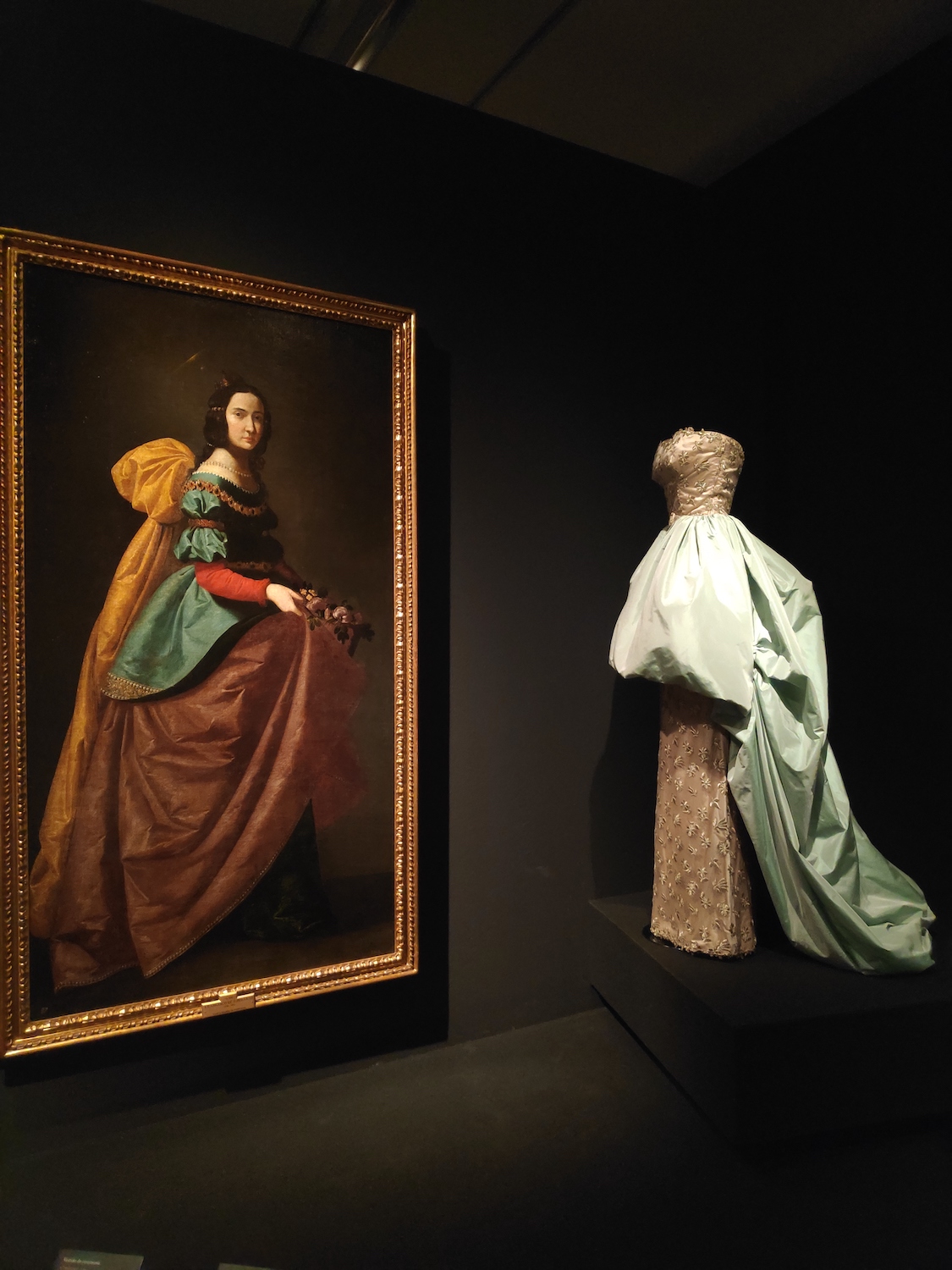 Otro caso es el retrato de María del Rosario de Silva y Gurtubay, duquesa de Alba, de Zuloaga junto a un imponente vestido de noche rojo de 1952; o la Santa Casilda de Zurbarán que se presenta junto a un conjunto de noche de vestido y sobrefalda de 1951.