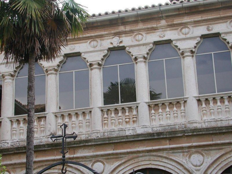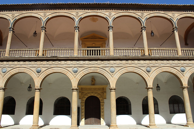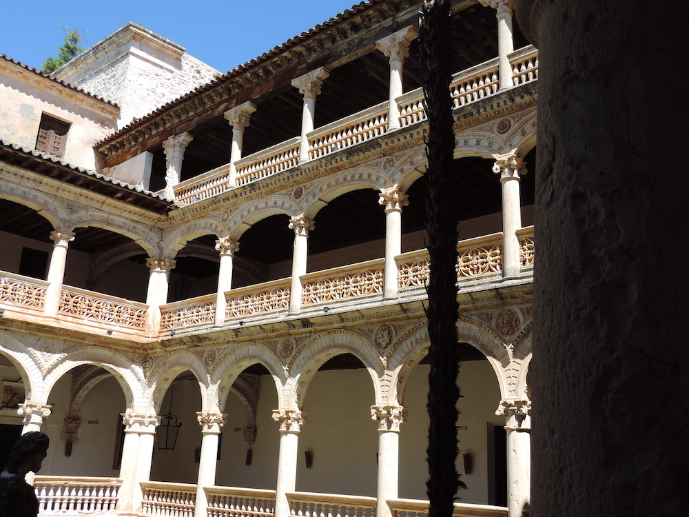 Se nota que el de Ocaña es un ejemplo más temprano por rasgos tradicionales como el uso de zapatas al igual que sucedía en el claustro de Lupiana, elemento que, sumado a la balaustrada empleada, recuerda a la forma en que habría trabajado Vasco de la Zarza en el Palacio de Polentinos [sobre este palacio ver post anterior aquí], quien también fue un importante teórico de la arquitectura y podría haberle aconsejado en su primera estancia en Lupiana. Entra además en juego un elemento la plena integración de los espejos en las enjutas en sustitución de los medallones que, por las fechas que manejamos, se ha considerado a Covarrubias su introductor en la arquitectura hispánica. Por otro lado, aunque las obras de San Juan Bautista se contratasen en fechas similares se prolongaron durante mucho tiempo, viendo aquí por tanto un desempeño más maduro y la incorporación de un almohadillado en la fachada como en los palacios florentinos aunque, en este caso, se limite únicamente a cubrir el perímetro de los vanos contribuyendo así a articular y dinamizar la estructura.