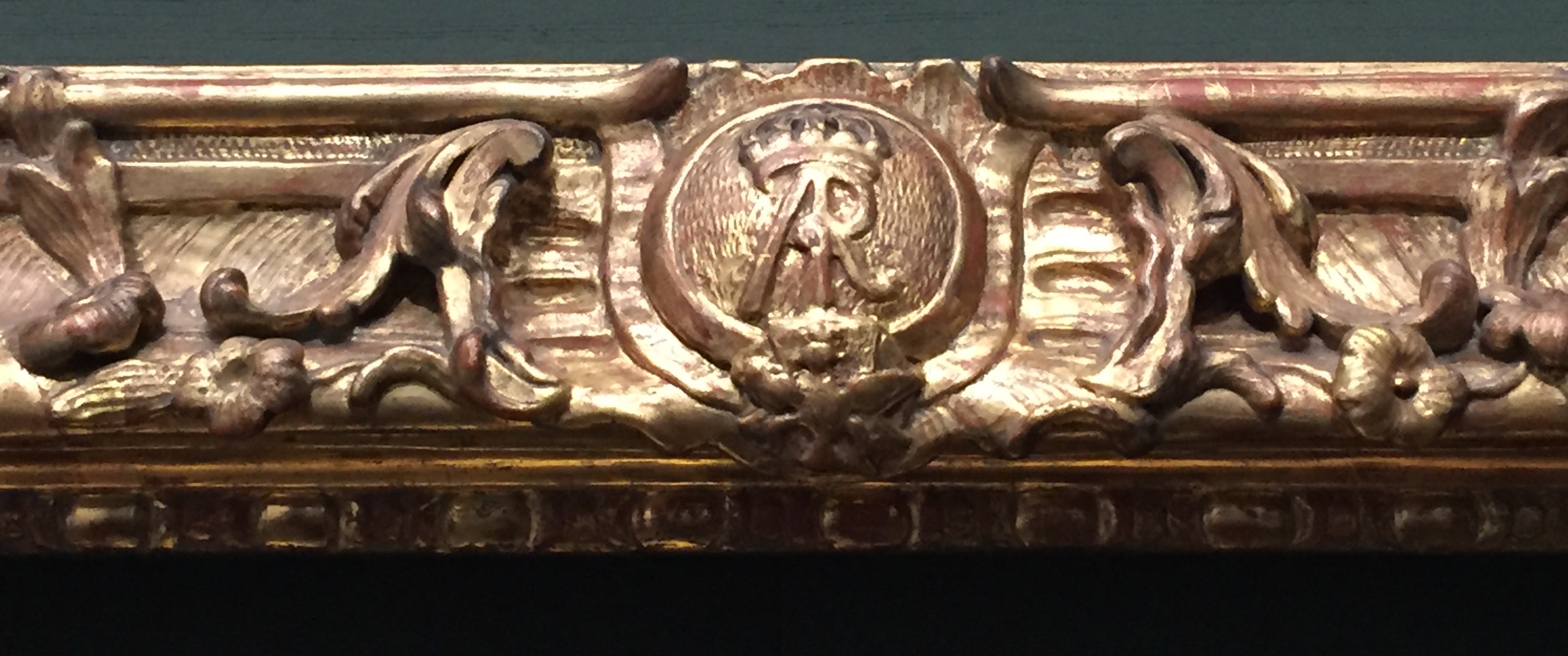 Además de permitir un diseño estéticamente consistente, los marcos también sirvieron para demostrar la propiedad real de las obras. En la parte inferior del marco hay un cartucho en el que se muestran las iniciales del rey, «AR» – «Augustus Rex»- bordeadas por la cinta de la Orden polaca del águila blanca. El larguero superior del marco estaba decorado con el escudo de armas sajón-polaco, originalmente rematado por una corona tallada en completo relieve. Solo se han conservado unos pocos marcos en su forma original ya que la mayoría de las coronas parecen haberse eliminado en la primera mitad del siglo XIX, cuando se agregaron los títulos a las pinturas.