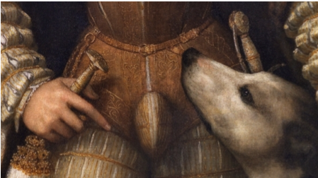 Uno de los retratos más interesantes a analizar, tanto desde la óptica de la pintura como de la indumentaria, es el que Bartolomé González realizó de Felipe III, rey de España, sedente. El monarca aparece sentado igual que Carlos V en la obra de Tiziano de 1548. Sin embargo, la diferencia es abismal en cuanto a la vestimenta y el color de ésta. El Emperador aparece sobre un fondo claro y viste una indumentaria negra que, recordemos, era protocolaria en la Corte. Por otro lado, Felipe III aparece con un bohemio, una prenda realizada en seda con aberturas y amplias solapas que procedía de la región de Bohemia. Este “sobretodo” es una pieza de gran lujo que venía acompañado de otros dos elementos exclusivos, la marta cibelina y los guantes perfumados con ámbar -tratados con ámbar para darles más suavidad y un olor distintivo-.