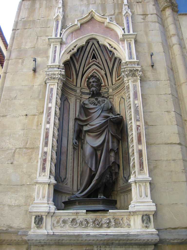 Un buen ejemplo de ello son los gremios. Éstos eran organizaciones de comerciantes y banqueros, divididas en los llamados Siete gremios Mayores (Arte di Calimala, importación y exportación de textiles; Arte del Cambio, banqueros y cambio de moneda; Arte della Lana, manufactura de la lana; Por Santa Maria, vendedores de telas, ubicados en la calle del mismo nombre; Vaiai e Pellicciai, peleteros; Medici e Speziali, médicos y boticarios; y Giudici e Notai, jueces y notarios) y los Catorce gremios Menores (Maestri di Pietra e Legname, trabajadores de la construcción; Beccai, carniceros; Calzolai, zapateros; Fabbri, herreros; Linaioli e Regattieri, trabajadores del lino y distribuidores de bienes de segunda mano; Vinattieri, vendedores de vino; Albergatori, posaderos; Cuoiai e Galigai, curtidores; Corazzai e Spadai, armeros; Chiavaiuioli, cerrajeros y fabricantes de herramientas; Legnaioli, carpinteros; Fornai, panaderos; Correggiai, fabricantes de correas y cinturones; y Oliantoli, vendedores de aceite)[6]. Dentro de estos gremios, existía una rivalidad muy evidente entre algunos de ellos, ya que, aunque todos ocupaban los sillones del gobierno local, eran los gremios mayores los que realmente representaban la riqueza de la ciudad. De hecho, estas organizaciones fueron las precursoras de lo que luego sería el boom del mecenazgo artístico en Florencia, fundamentalmente porque la Signoria había delegado en ellas la responsabilidad de ocuparse de ciertos edificios. Así, por ejemplo, el Arte della Lana se ocupaba de la catedral o el Arte di Calimala del baptisterio. Pero el verdadero precedente fue el caso del Arte della Seta, responsable de Orsanmichele, una iglesia construida a finales del siglo XIV sobre el huerto del anterior monasterio de San Miguel (de ahí el nombre Or San Michele). En esta iglesia, utilizada por los gremios más importantes, se llevó a cabo un proyecto inmenso que consistía en decorar toda la fachada con esculturas dentro de tabernáculos, entre las que podemos encontrar el San Juan Bautista de Ghiberti (1416), el San Jorge de Donatello (1417) o la célebre Duda de Santo Tomás de Verrocchio (1483). Porque, aunque la actividad de los gremios no necesite realmente de una explicación basada en la teoría de la magnificencia, sí es importante entender que fueron los precursores de lo que luego querrían hacer las familias ricas, y que de hecho hicieron: utilizar el arte como herramienta política con la cual, además, adquirir prestigio social.