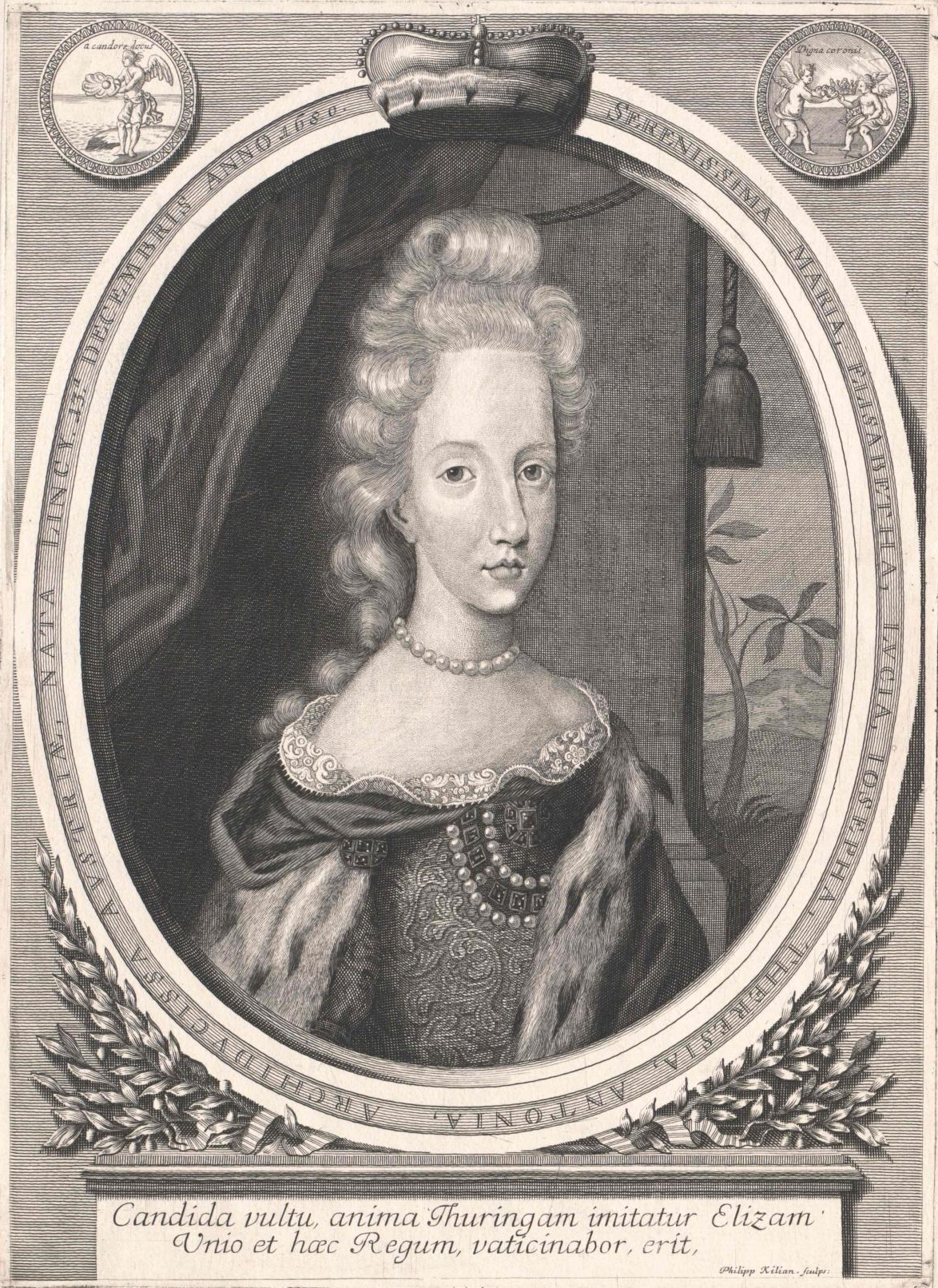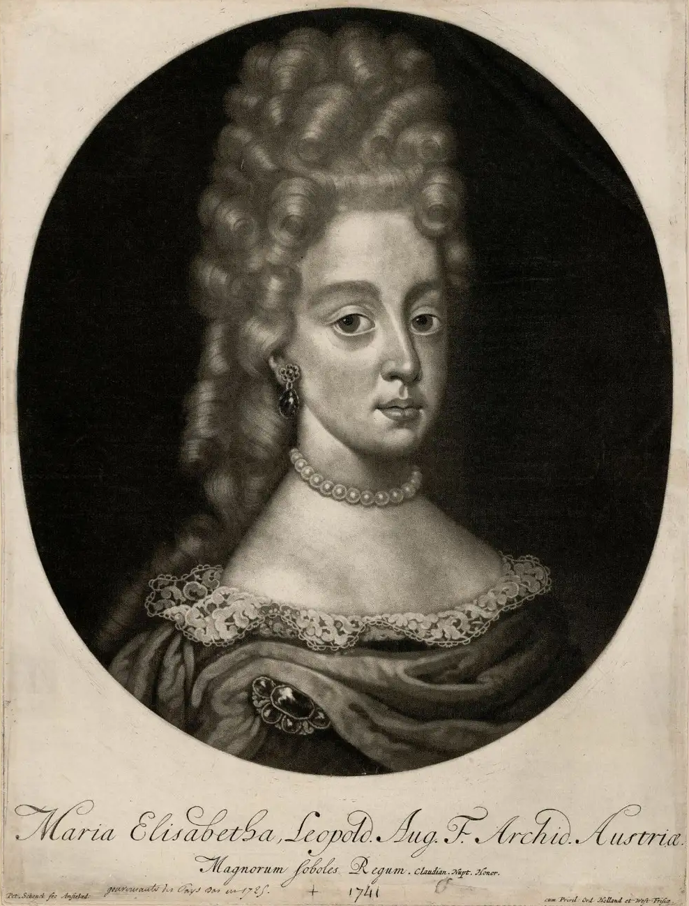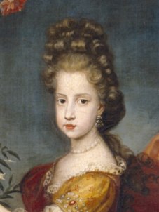 En concreto, creemos que la joven cogiendo flores de un jarrón, se trata de la archiduquesa María Isabel de Austria (1680-1741), hija mayor de Leopoldo I y de Leonor de Neoburgo que llegó a ser gobernadora de los Países Bajos. Se puede identificar en base a los grabados de la época, donde presenta un aspecto y peinado parecido (Fig. 6, 6a y 6b)