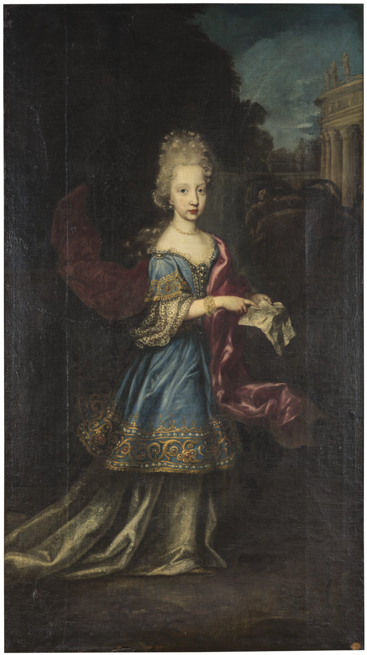 La segunda serie de retratos a que hacíamos referencia al comienzo, se trataba de representaciones de cuerpo entero de las Casas de Neoburgo y de Austria, por estar casada la mayor de las hermanas de la Reina, Leonor Magdalena, con el emperador Leopoldo I de Austria. Varios de los cuadros de la serie, si no todos, se salvaron del incendio el Alcázar de Madrid en 1734[11], pues en la lista de cuadros rescatados y depositados en las casas del Marqués de Bedmar, figuran con los números 717 a 721, varios retratos de cuerpo entero, de parecidas dimensiones, indicándose en uno de ellos que se trata del emperador Carlos VI, y dos retratos de niñas “de la misma familia”, una con un papel de solfa y otra cogiendo frutas. También debían pertenecer a este grupo los números 834 y 835, que representaban a “una princesa de la familia del Emperador cogiendo unas flores algo maltratado” y un Rey de Hungría (en aquel momento el futuro emperador José I). El listado recoge otros retratos reales de parecidas dimensiones, pero no facilita más datos que permitan asociarlos con un mínimo de certeza a esta serie.