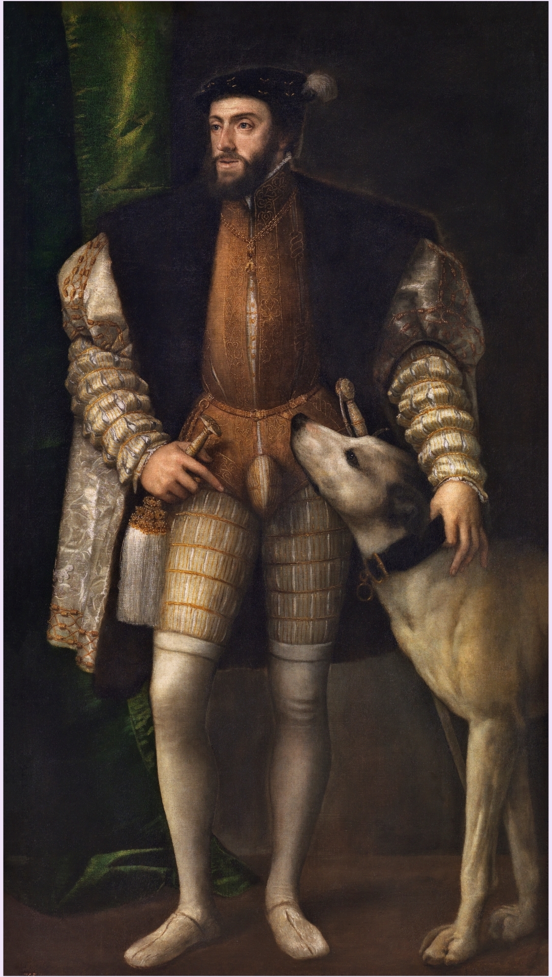 El primer ejemplo donde podemos ver cómo Tiziano sabe emplear los recursos de su arte, para hacer una “dissimulatio”, que finalmente acabó por construir la imagen colectiva que tenemos de un personaje histórico, es el retrato de Carlos V con un perro de 1533 (Museo del Prado, cat. P000409). En este retrato, realizado en Bolonia, Tiziano toma un modelo ya creado, el retrato de mismo nombre y apariencia realizado un año antes por el pintor Jacob Seisenegger (1505 – 1567) y que se conserva en Viena (Kunsthistoriches Museum, Gemäldegalerie, inv. A114). Aunque en un primer vistazo rápido nos parezca el mismo cuadro, Seisenegger ha hecho un retrato minucioso, con gran lujo de detalles, propio de la tradición centroeuropea. No ha disimulado el prognatismo del emperador ni su constitución física y en cambio se ha recreado en el lujo de las vestiduras y en las calidades de las telas de seda y sus brillos, así como en dejarnos evidencias de que el animal que acompaña al emperador es una perra de raza inglesa. Mientras que Tiziano ha estilizado el tronco, variando el tamaño de la pelliza de pieles respecto al jubón, ha cambiado el punto del horizonte, para resaltar la figura, y ha oscurecido el fondo, recurso éste que será de gran trascendencia en los retratos áulicos. Además, ha cambiado el rostro del emperador puesto que le ha levantado los párpados, ha disimulado su prognatismo y ha cambiado sutilmente el perfil de la nariz. Evidentemente la imagen de Tiziano será más apreciada por el emperador para difundir su imagen y será esta nueva fisonomía la que se popularice para las representaciones del mismo.