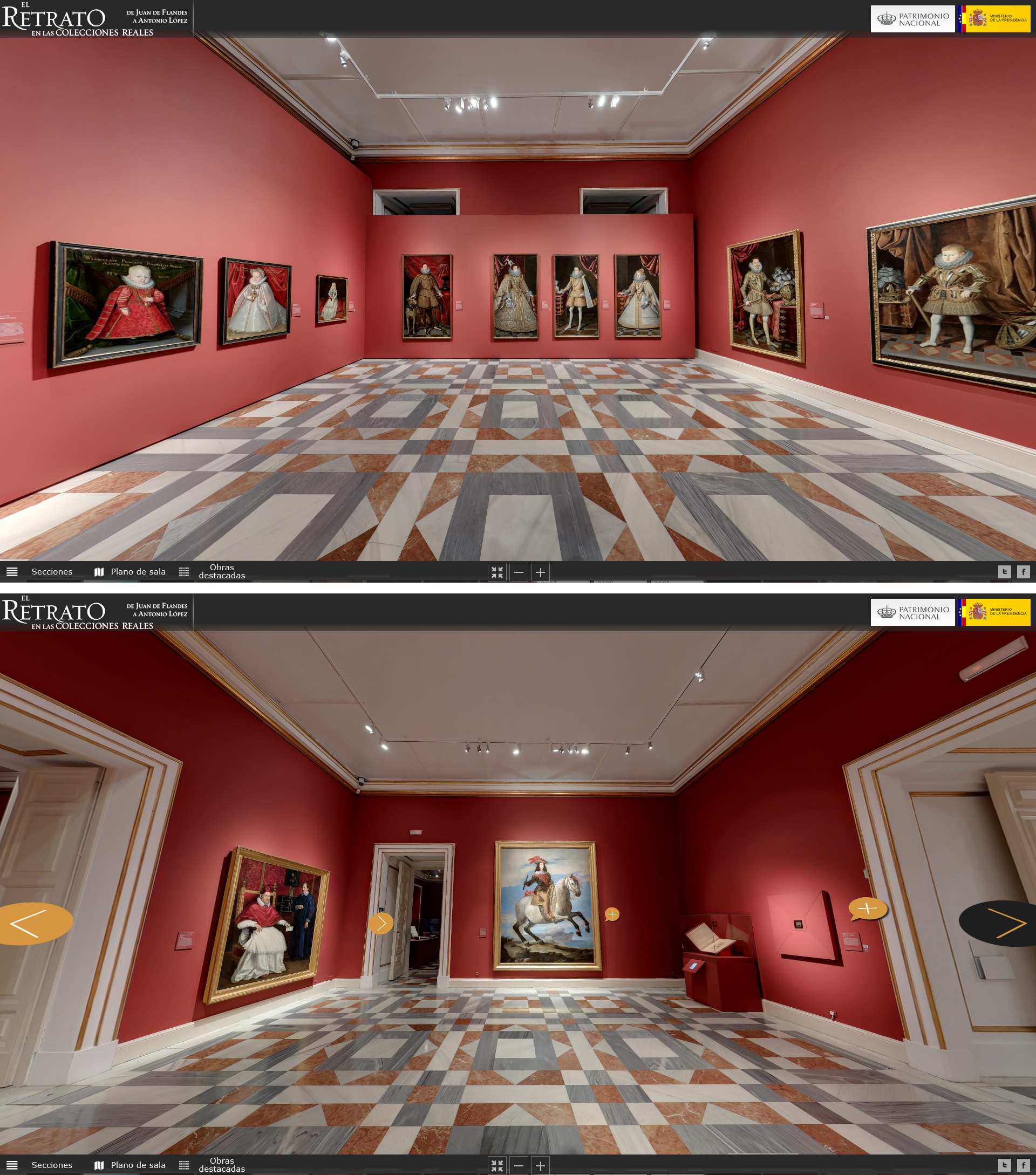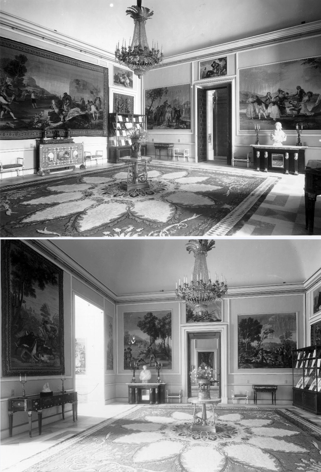 Sin embargo, el aficionado de hoy quedará sorprendido al ver en los suelos alfombras del siglo XIX, como esta de la Real Fábrica de Tapices de Santa Bárbara que, firmada por Gabino Stuyck en 1827, por fuerza debía pisar el poco público que tras una guerra civil y otra mundial se entretenía con tales cosas.