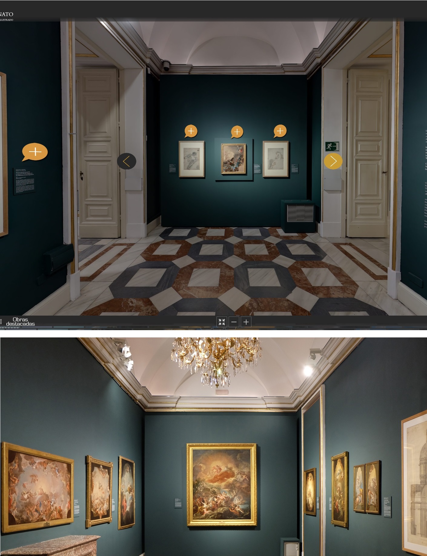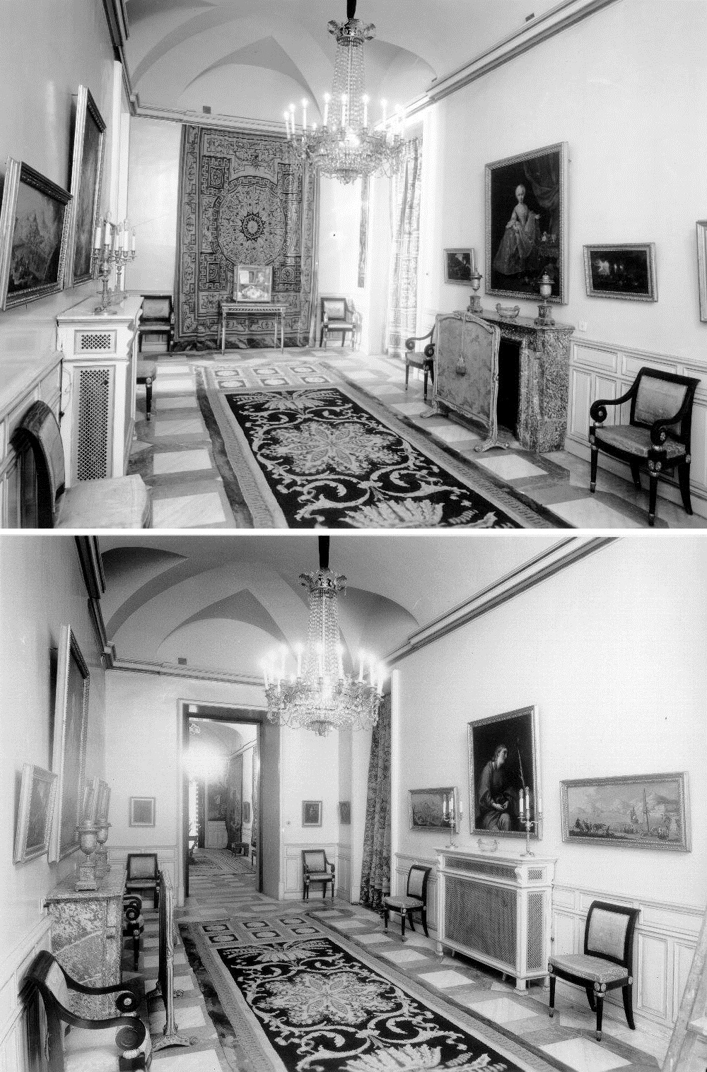 Dejando a la derecha un espantoso cubre radiador, a los lados de la puerta del fondo se veían un par de pequeños retratos de Fernando VII y María Cristina de Borbón, por Francisco Lacoma, junto a la Academia de dibujo, de Houasse, y La naranjera, de Luis Paret, «de Goya coetáneo y dispar», como escribiera María Luisa Caturla.