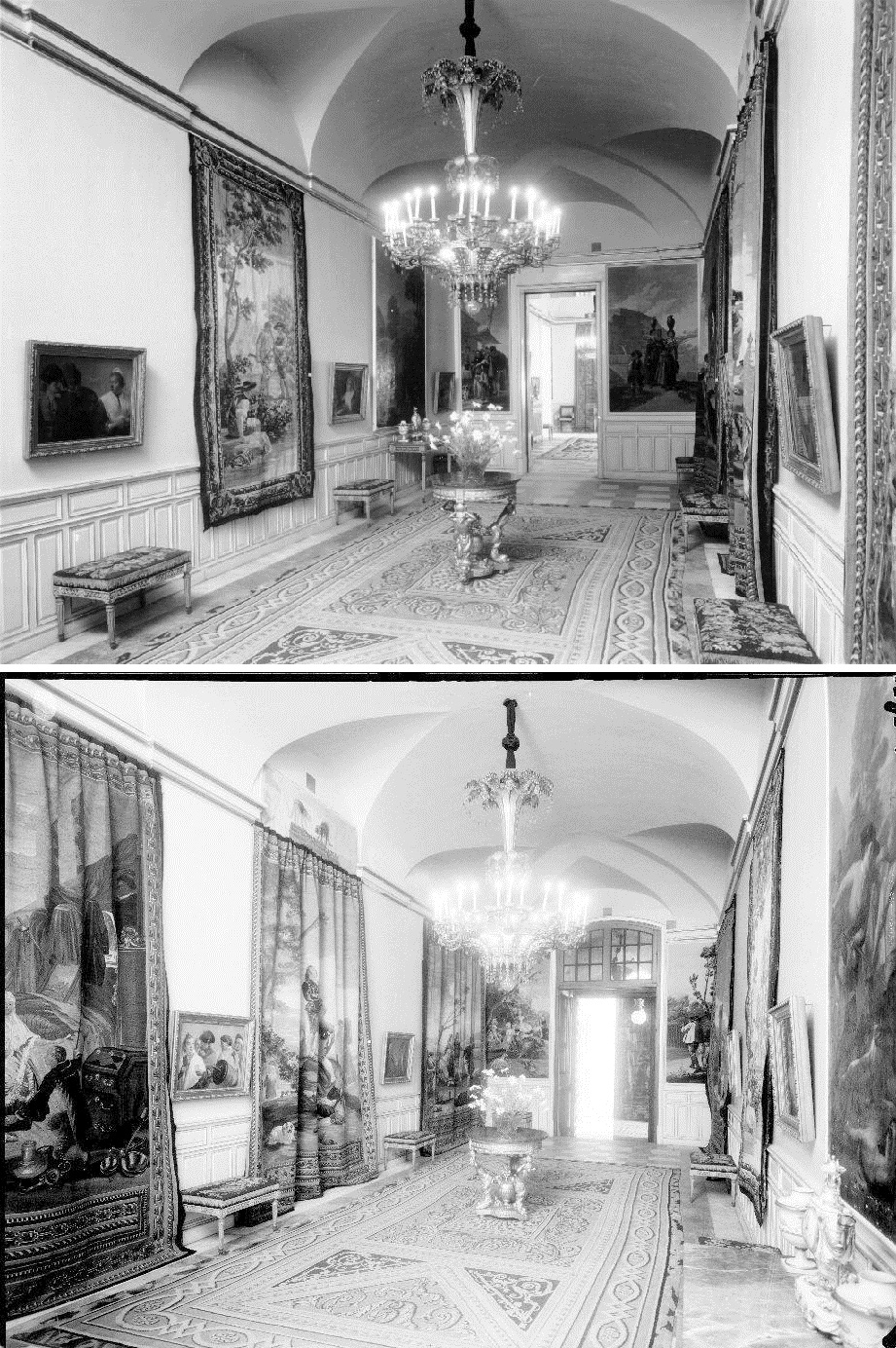 En esos espacios palatinos, con sus grandes puertas y ventanas, sus bóvedas y lámparas, los tapices lucían bien y, en general, todas las obras que allí figuraron. En muchos casos los paños de lana y seda quedaban aceptablemente adaptados a los tramos de pared y también a las sobrepuertas, buscando el efecto de origen, aunque varios parecen estar doblados para ajustar su encaje y otros colgaban a modo de cortinas, llegando a apoyar en el pavimento de mármoles.